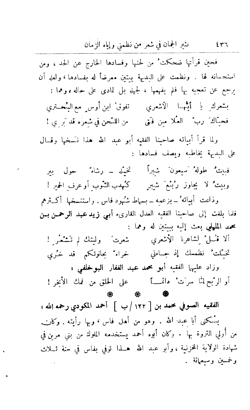 وذاعت أبياته-بزعمه-بسماط شهود فاس. واستنسخها أكثرهم فلما بلغت إلى صاحبنا الفقيه العدل القارىء أبي زيد عبد الرحمن بن محمد المليلي بعث إليه ببيتين له وهما:
