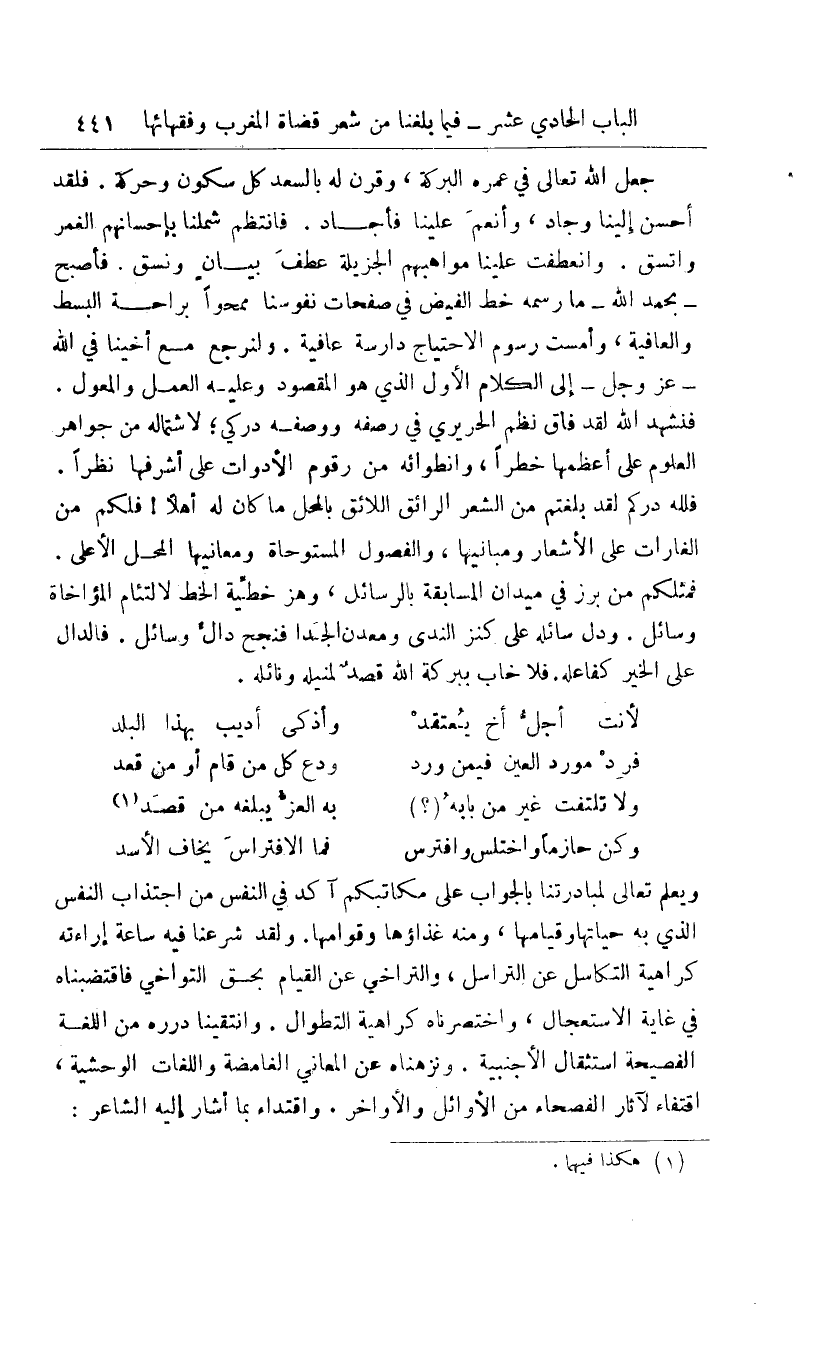 جعل الله تعالى في عمره البركة، وقرن له بالسعد كل سكون وحركة. فلقد أحسن إلينا وجاد، وأنعم علينا فأجاد. فانتظم شملنا بإحسانهم الغمر واتسق. وانعطفت علينا مواهبهم الجزيلة عطف بيان ونسق. فأصبح -بحمد الله-ما رسمه خط الفيض في صفحات نفوسنا ممحوا براحة البسط والعافية، وأمست رسوم الاحتياج دارسة عافية. ولنرجع مع أخينا في الله -عز وجل-إلى الكلام الأول الذي هو المقصود وعليه العمل والمعول.