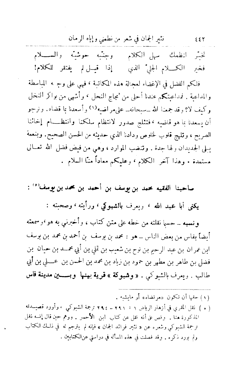 (*) نقل المقري في أزهار الرياض 1:291 - 294 ترجمة الشبوكي، وأورد قصيدته المذكورة هنا. ونص على أنه نقل عن كتاب ابن الأحمر. ووهم حين قال إنه نقل ترجمة الشبوكي وشعره عن «نثير فرائد الجمان» فإنه لم يترجم له في ذلك الكتاب ولم يورد ذكره. وقد فصلت في هذه المسأله في دراستي عن الكتابين.