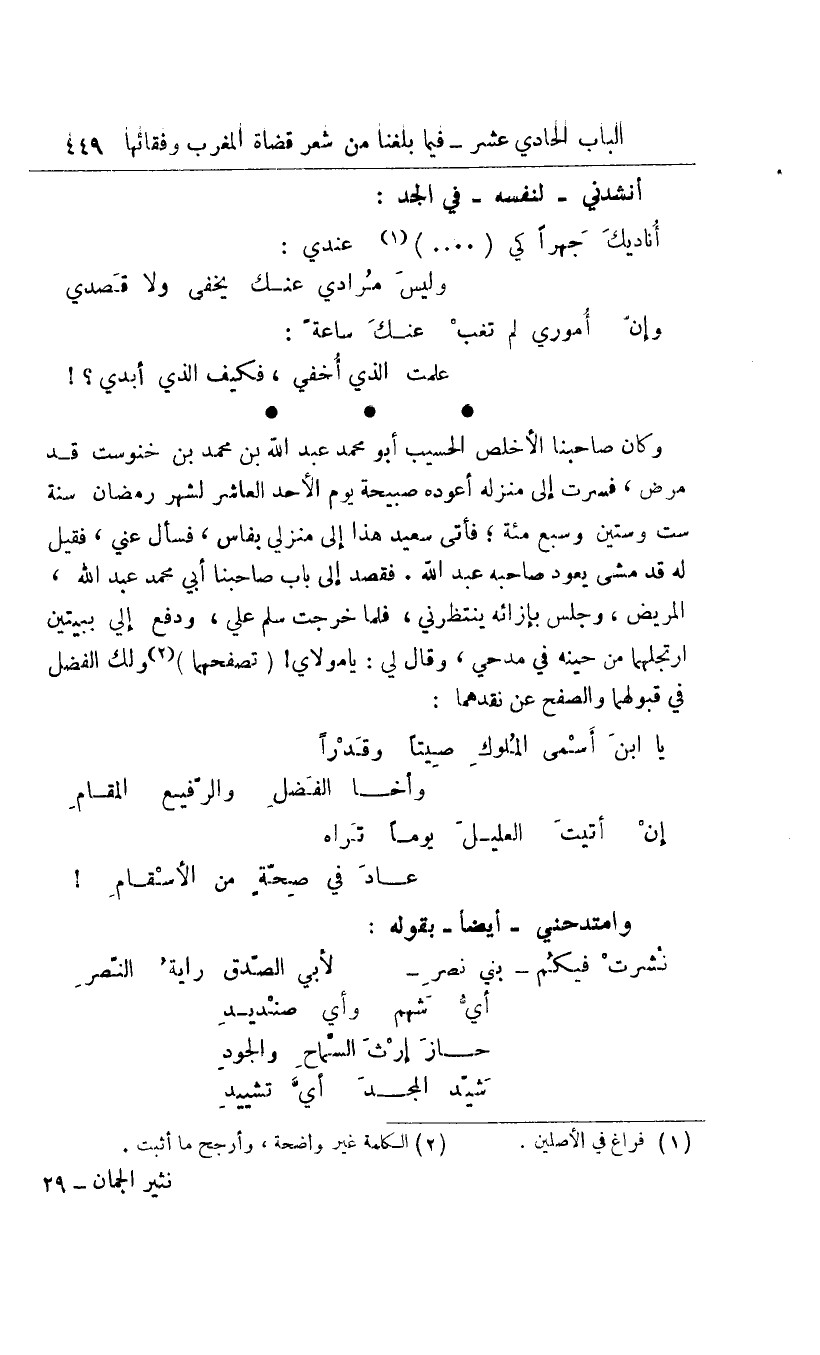 ... وكان صاحبنا الأخلص الحسيب أبو محمد عبد الله بن محمد بن خنوست قد مرض، فسرت إلى منزله أعوده صبيحة يوم الأحد العاشر لشهر رمضان سنة ست وستين وسبع مئة؛ فأتى سعيد هذا إلى منزلي بفاس، فسأل عني، فقيل له قد مشى يعود صاحبه عبد الله. فقصد إلى باب صاحبنا أبي محمد عبد الله، المريض، وجلس بإزائه ينتظرني، فلما خرجت سلم علي، ودفع إلي ببيتين ارتجلهما من حينه في مدحي، وقال لي: يا مولاي! (تصفحهما) (¬2) ولك الفضل في قبولهما والصفح عن نقدهما: