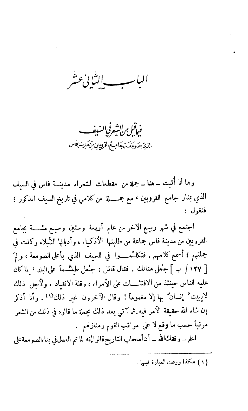 اجتمع في شهر ربيع الآخر من عام أربعة وستين وسبع مئة بجامع القرويين من مدينة فاس جماعة من طلبتها الأذكياء، وأدبائها النّبلاء وكنت في جملتهم؛ أسمع كلامهم. فتكلّموا في السيف الذي بأعلى الصومعة، ولم [127/ب] جعل هنالك. فقال قائل: جعل طلّسما على البلد، لما كان عليه الناس حينئذ من الافتئات على الأمراء، وقلة الانقياد. ولأجل ذلك لا يبيت إنسان بها إلا مغموما! وقال الآخرون غير ذلك (¬1). وأنا أذكر إن شاء الله حقيقة الأمر فيه. ثم آتي بعد ذلك بجملة ما قالوه في ذلك من الشعر مرتبا حسب ما وقع لا على مراتب القوم ومنازلهم.