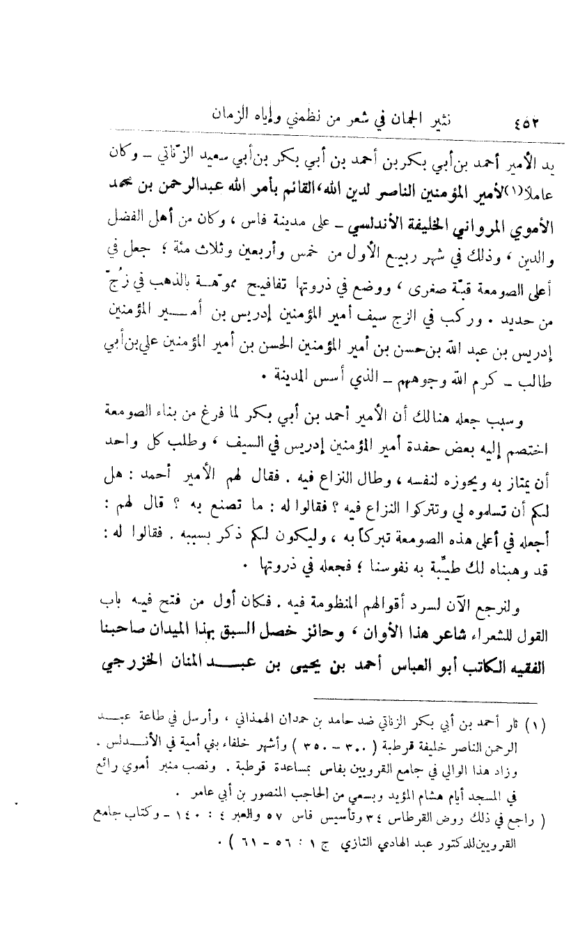 (¬1) ثار أحمد بن أبي بكر الزناتي ضد حامد بن حمدان الهمذاني، وأرسل في طاعة عبد الرحمن الناصر خليفة قرطبة (300 - 350) وأشهر خلفاء بني أمية في الأندلس. وزاد هذا الوالي في جامع القرويين بفاس بمساعدة قرطبة. ونصب منبر أموي رائع في المسجد أيام هشام المؤيد وبسعي من الحاجب المنصور بن أبي عامر. (راجع في ذلك روض القرطاس 34 وتأسيس فاس 57 والعبر 4:140 - وكتاب جامع القرويين للدكتور عبد الهادي التازي ج 1:56 - 61).
