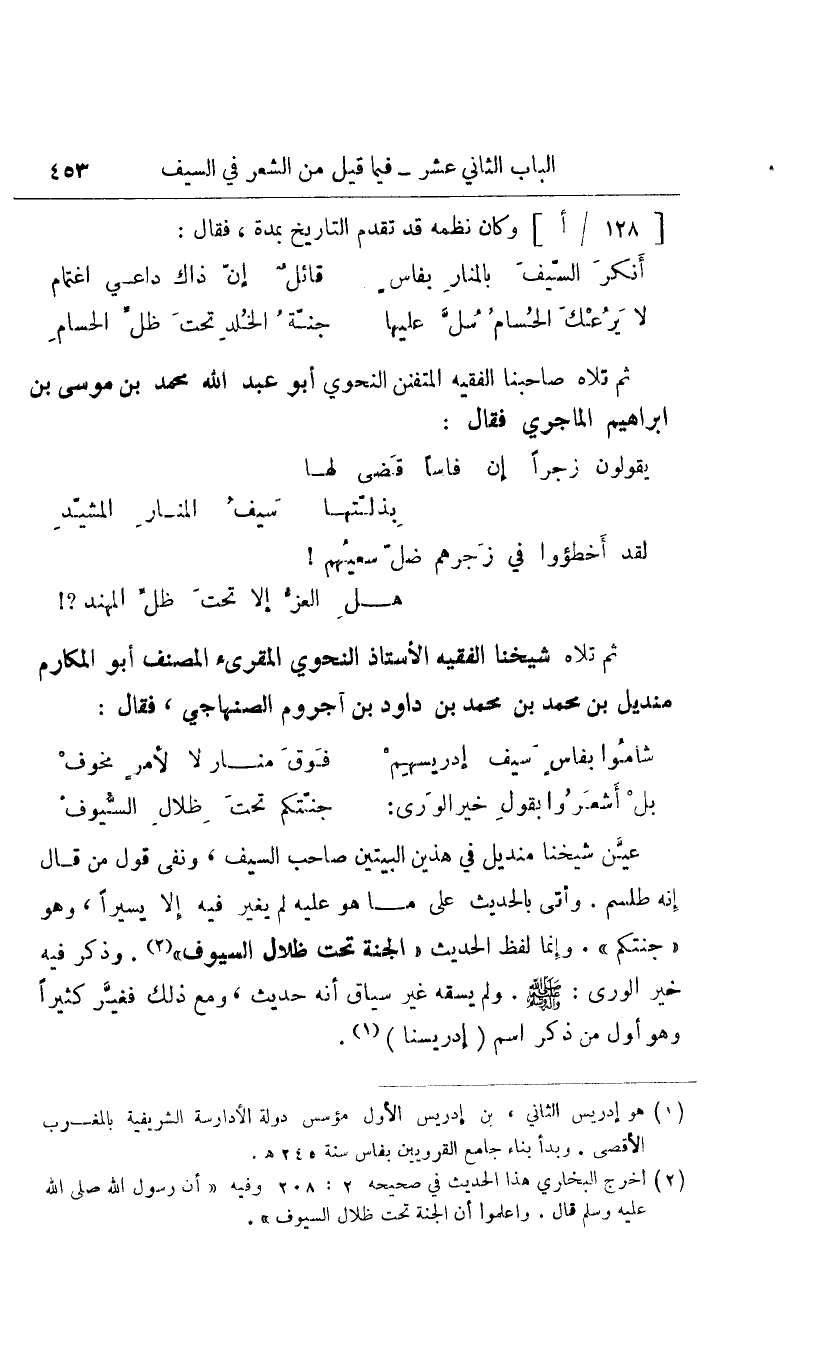 عيّن شيخنا منديل في هذين البيتين صاحب السيف، ونفى قول من قال إنه طلسم. وأتى بالحديث على ما هو عليه لم يغير فيه إلا يسيرا، وهو «جنتكم». وإنما لفظ الحديث «الجنة تحت ظلال السيوف» (¬1). وذكر فيه خير الورى: صلى الله عليه وسلم. ولم يسقه غير سياق أنه حديث، ومع ذلك فغيّر كثيرا وهو أول من ذكر اسم (إدريسنا) (¬2).