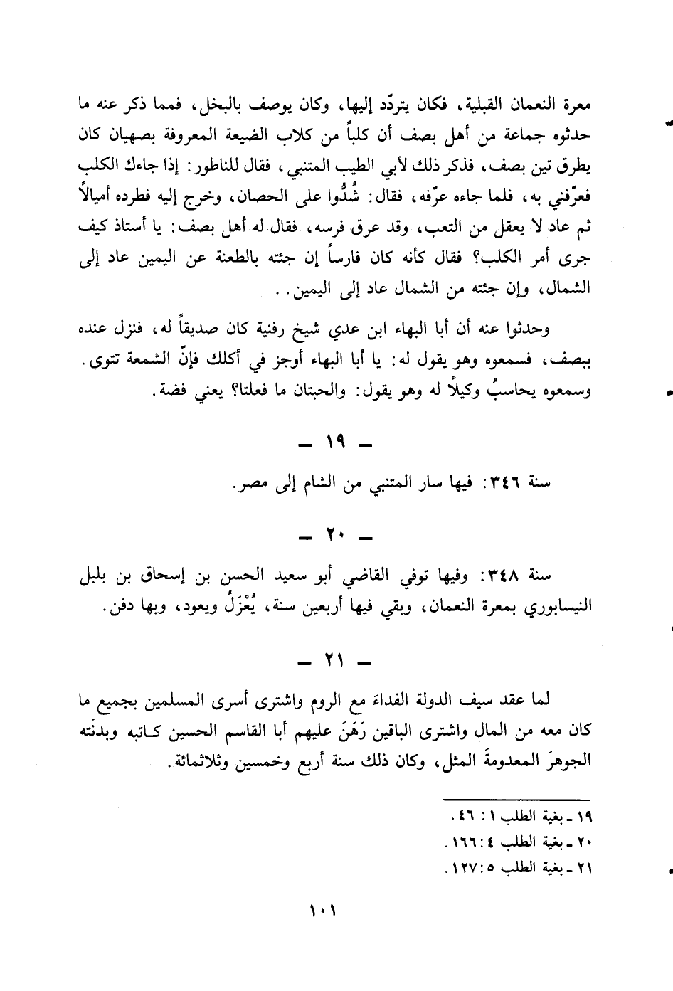 معرة النعمان القبلية، فكان يتردد إليها، وكان يوصف بالبخل، فمما ذكر عنه ما حدثوه جماعة من أهل بصف أن كلباً من كلاب الضيعة المعروفة بصهيان كان يطرق تين بصف، فذكر ذلك لأبي الطيب المتنبي، فقال للناطور: إذا جاءك كلب فعرفني به، فلما جاءه عرفه فقال: شدوا على الحصان، وخرج إليه فطرده أميالاً ثم عاد لا يعقل من التعب، عقد عرق فرسه فقال له أهل بصف: يا أستاذ كيف جرى أمر الكلب؟ فقال كأنه كان فارساً إن جئته بالطعنة عن اليمين عاد إلى الشمال، وإن جئته من الشمال عاد إلى اليمين. .
