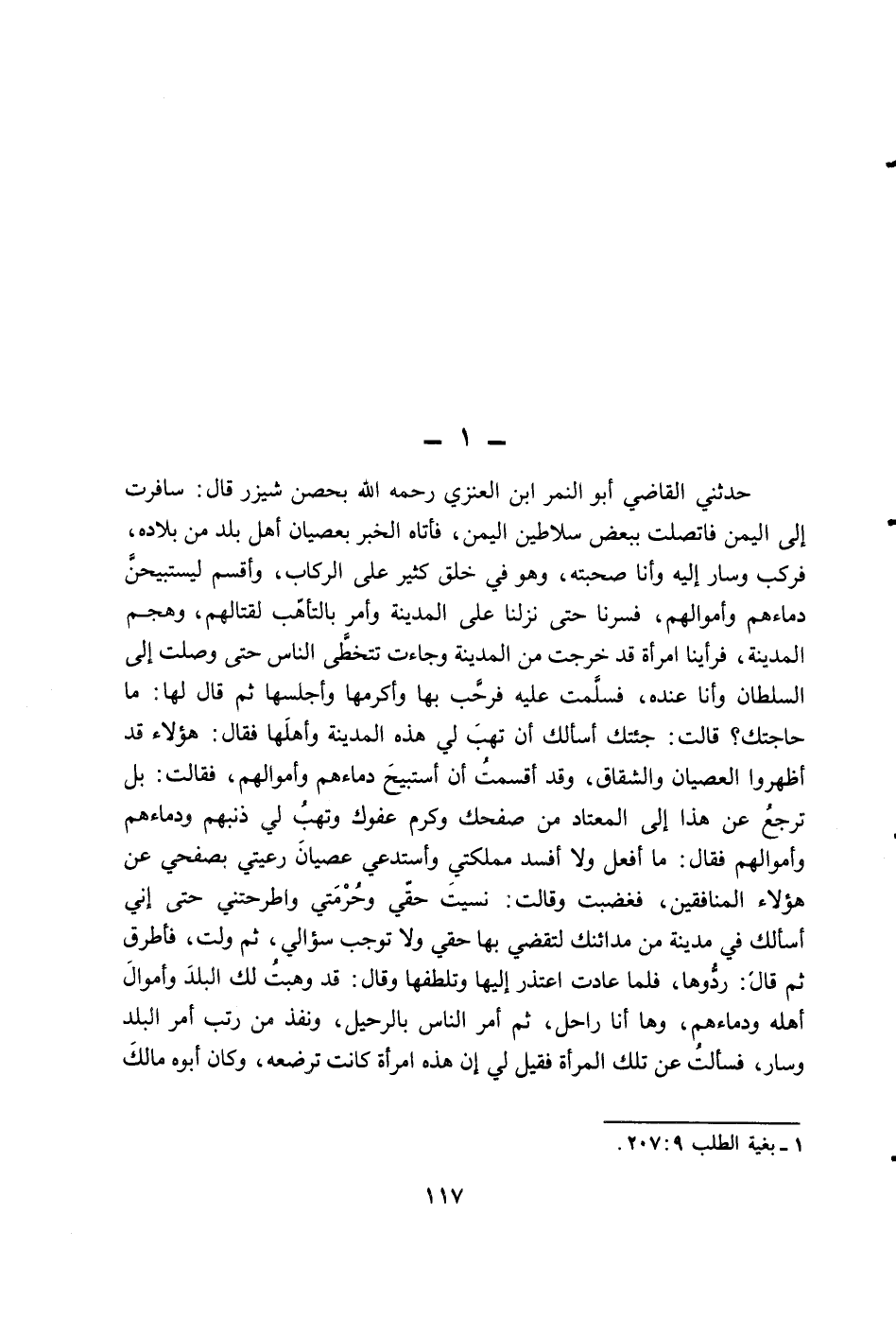 حدثني القاضي أبو نمر ابن المعتري رحمه الله بحصن شيزر قال: سافرت إلى اليمن فاتصلت ببعض سلاطين اليمن، فأتاه الخبر بعصيان أهل بلد من بلاده، فركب وسار إليه وأنا صحبته، وهو في خلق كثير من الركاب، وأقسم ليستبيحنَّ دماءهم وأموالهم، فسرنا حتى نزلنا على المدينة وأمر بالتأهّب لقتالهم، وهجم المدينة، فرأينا امرأة قد خرجت من المدينة وجاءت تتخطَّى الناس حتى وصلت إلى السلطان وأنا عنده، فسلَّمت عليه فرحَّب بها وأكرمها وأجلسها ثم قال لها: ما حاجتك؟ قالت: جئتك أسألك أن تهب لي هذه المدينة وأهلها فقال: هؤلاء قد أظهروا العصيان والشقاق، وقد أقسمتُ أن أستبيح دماءهم وأموالهم، فقالت: بل ترحعُ عن هذا إلى المعتاد من صفحك وكرم عفوك وتهبُ لي ذنبهم ودماءهم وأموالهم فقال: ما أفعل ولا أفسد مملكتي وأستدعي عصيانَ رعيتي بصفحي عن هؤلاء المنافقين، فغضبت وقالت: نسيتَ حقّي وحُرْمَتي واطرحتني حتى إني أسألك في المدينة من مدائنك لتقضي بها حقي ولا توجب سؤالي، ثم ولت، فأطرق ثم قالَ: ردُّها، فلما عادت اعتذر إليها وتلطفها وقال: قد وهبت لك البلدَ وأموالَ أهله ودماءهم، وها أنا راحل، ثم أمر الناس بالرحيل، ونفذ من رتب أمر البلد وسار، فسالتُ عن تلك المرأة فقيل لي إن هذه امرأة كانت ترضعه، وكان أبوه مالكَ
