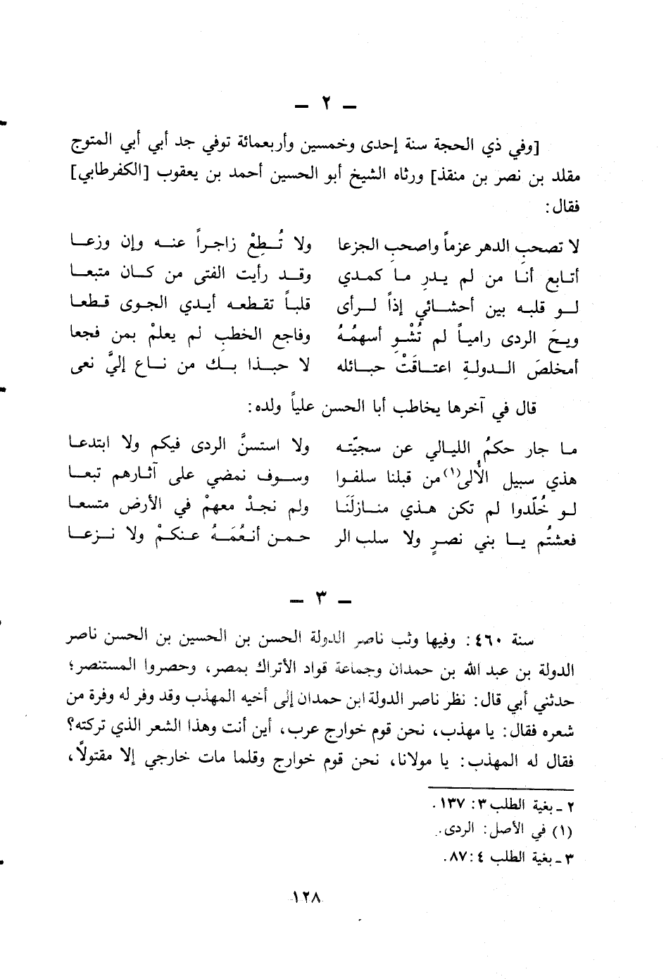 [وفي ذي الحجة سنة إحدى وخمسين وأربعمائة توفي جد أبي أبي المتوج مقلد بن نصر بن منقذ] ورثاه الشيخ أبو الحسين أحمد بن يعقوب [الكفرطابي] فقال: