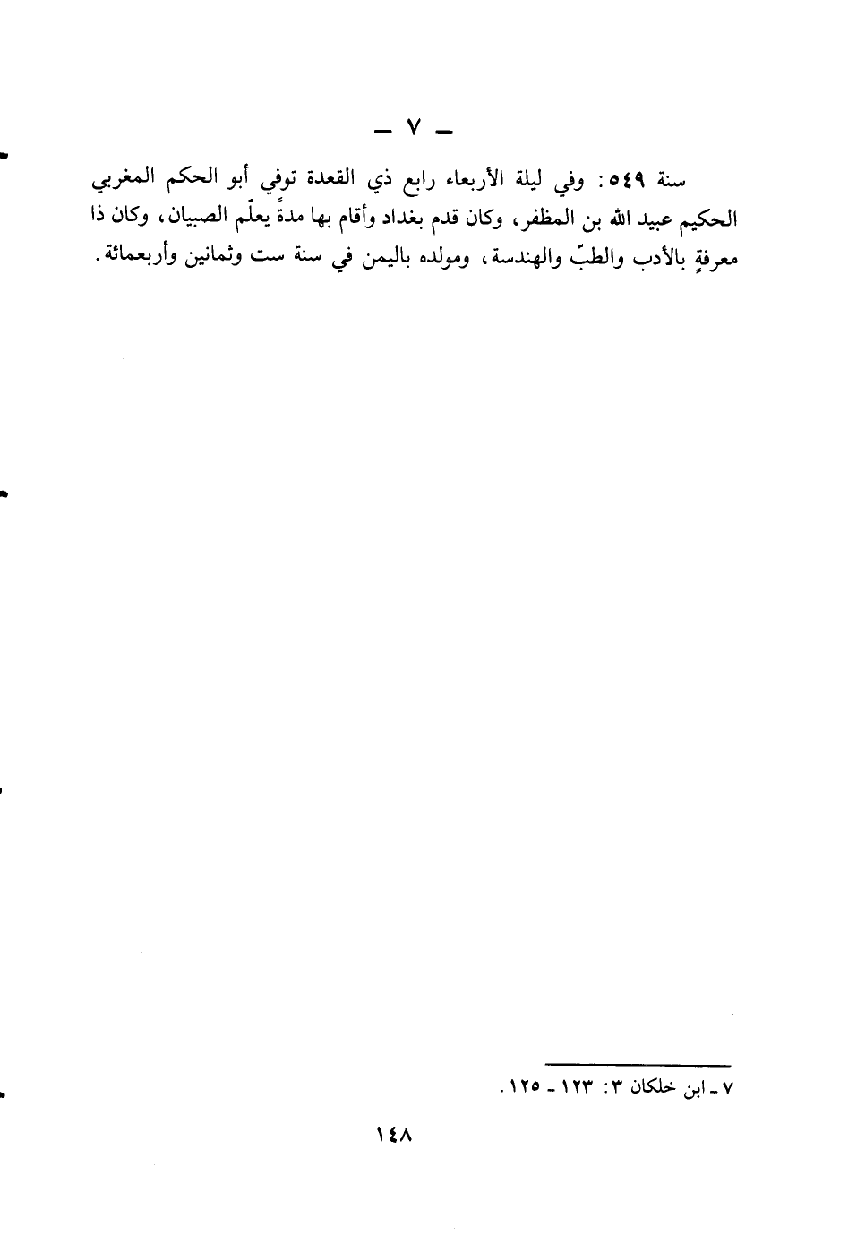 سنة 549: وفي ليلة الأربعاء رابع ذي القعدة توفي أبو الحكم المغربي الحكيم عبيد الله بن المظفر، وكان قدم بغداد وأقام بها مدة يعلم الصبيان، وكان ذا معرفةٍ بالأدب والطب والهندسة، ومولده باليمن في سنة ست وثمانين وأربعمائة.