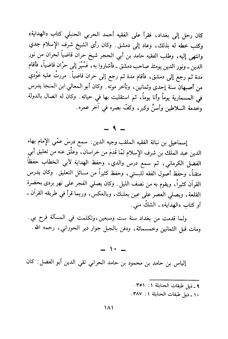 كان رحل إلى بغداد، فقرأ على الفقيه أحمد الحربي الحنبلي كتاب " الهداية " وكتب خطه له بذلك، وعاد إلى دمشق. وكان رأى الشيخ شرف الإسلام جدي وانتهى إليه، وطلب الفقيه حامد بن أبي الحجر شيخ حران قاضياً لحران من نور الدين ونور الدين يومئذ صاحب دمشق فأشاروا به، فسير إلى حران قاضياً، فأقام مدة ثم رجع إلى دمشق، فأقام مدة ثم رجع إلى حران قاضياً. مررت عليه عودي من أصبهان سنة إحدى وثمانين، وتأخر موته. وكان أبو المعالي ابن المنجا يدرس في المسمارية يوماً وأنا يوماً، ثم استقليت بها في حياته. وكان له اتصال بالدولة وخدمة السلاطين وأسن وكبر، وكف بصره في آخر عمره.