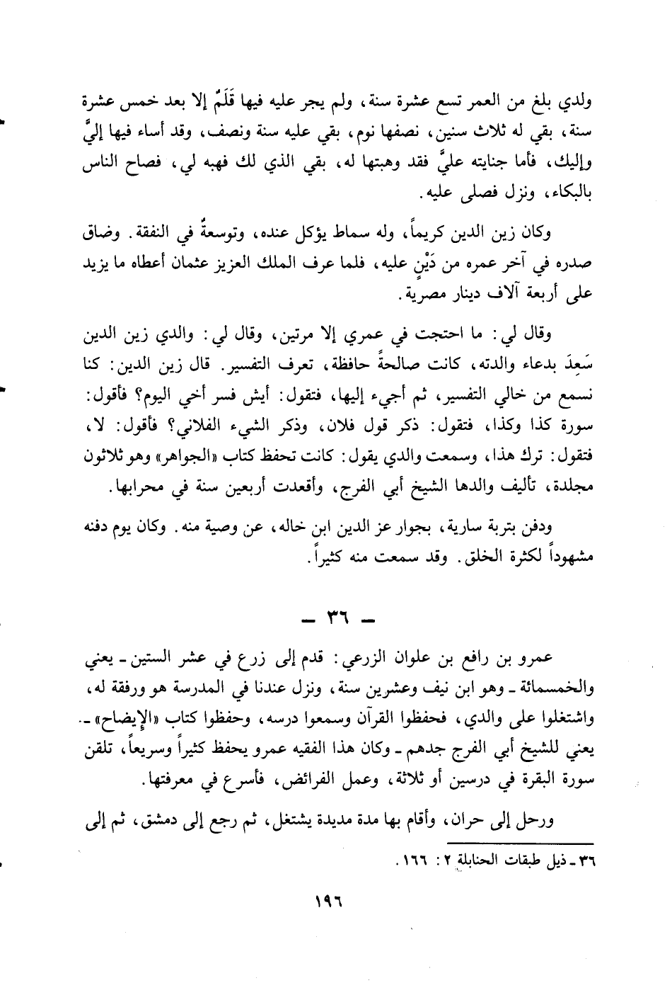 عمرو بن رافع بن علوان الزرعي: قدم إلى زرع في عشر الستين يعني والخمسمائة وهو ابن نيف وعشرين سنة، ونزل عندنا في المدرسة هو ورفقة له، واشتغلوا على والدي، فحفظوا القرآن وسمعوا درسه، وحفظوا كتاب " الإيضاح " يعني للشيخ أبي الفرج جدهم وكان هذا الفقيه عمرو يحفظ كثيراً وسريعاً، تلقن سورة البقرة في درسين أو ثلاثة، وعمل الفرائض، فأسرع في معرفتها.