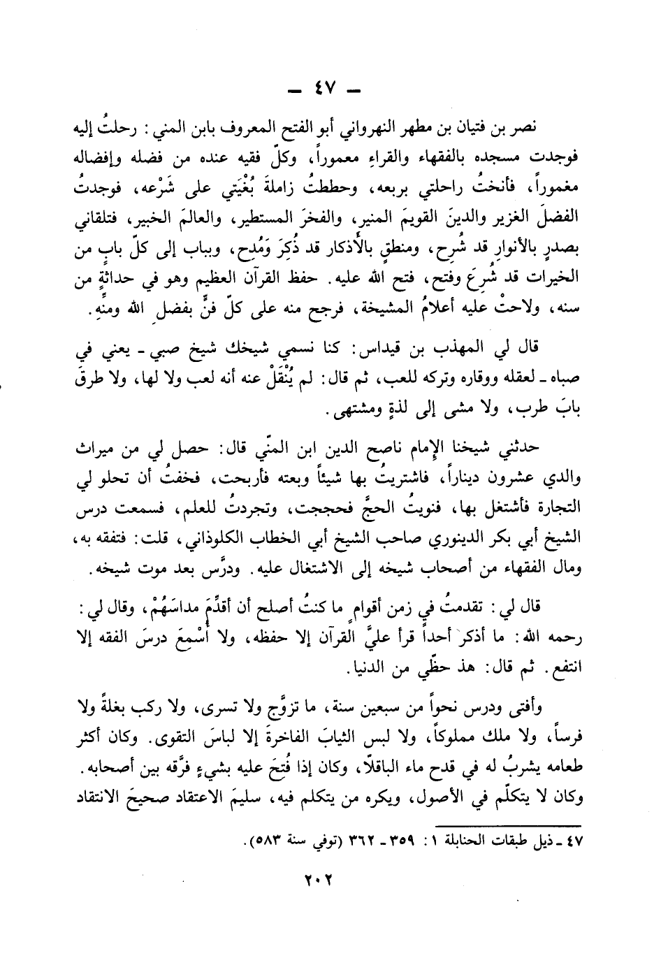 نصر بن فتيان بن مطهر النهرواني أبو الفتح المعروف بابن المني: رحلت إليه فوجدت مسجده بالفقهاء والقراء معموراً، وكل فقيه عنده من فضله وإفضاله مغموراً، فأنخت راحلتي بربعه، وحططت زاملة بغيتي على شرعه، فوجدت الفضل الغزير والدين القويم المنير، والفخر المستطير، والعالم الخبير، فتلقاني بصدر بالأنوار قد شرح، ومنطق بالأذكار قد ذكر ومدح، وبباب إلى كل باب من الخيرات قد شرع وفتح، فتح الله عليه. حفظ القرآن العظيم وهو في حداثة من سنه، ولاحت عليه أعلام المشيخة، فرجح منه على كل فن بفضل الله ومنه.