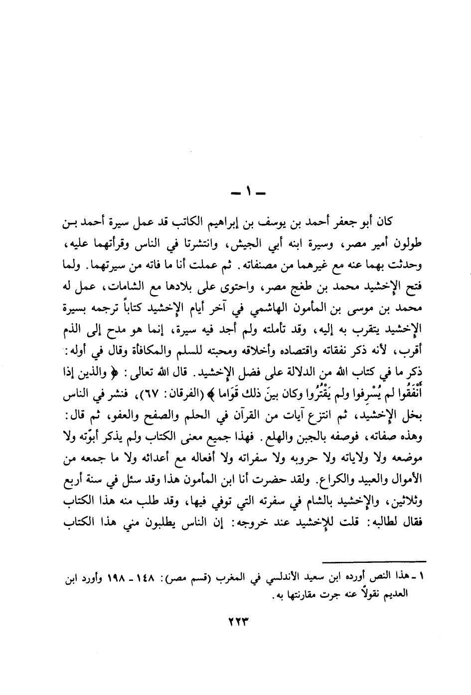 كان أبو جعفر أحمد بن يوسف بن إبراهيم الكاتب قد عمل سيرة أحمد بن طولون أمير مصر، وسيرة ابنه أبي الجبش، وانتشرنا في الناس وقرأتهما عليه، وحدثت بهما عنه مع غيرهما من مصنفاته. ثم عملت أنا ما فاته من سيرتهما. ولما فتح الإخشيد محمد بن طغج مصر، واحتوى على بلادها مع الشامات، عمل له محمد بن موسى بن المأمون الهاشمي في آخر أيام الإخشيد كتاباً ترجمه بسيرة الإخشيد يتقرب به إليه، وقد تأملته ولم أجد فيه سيرة إنما هو مدح إلى الذم أقرب، لأنه ذكر نفقاته واقتصاده وأخلاقه ومحبته للسلم والمكافأة وقال في أوله: ذكر ما في كتاب الله من الدلالة على فضل الإخشيد. قال الله تعالى: {والذين إذا انفقوا لم يسرفوا ولم يقتروا وكان بين ذلك قواما} (الفرقان:67) ، فنشر في الناس بخل الإخشيد، ثم انتزع آيات من القرآن في الحلم والصفح والعفو، ثم قال: وهذه صفاته، فوصفه بالجبن والهلع. فهذا جميع معنى الكتاب ولم يذكر أبوته ولا موضعه ولا ولاياته ولا حروبه ولا سفراته ولا أفعاله مع أعدائه ولا ما جمعه من الأموال والعبيد والكراع. ولقد حضرت أنا ابن المأمون هذا وقد سئل في سنة أربع وثلاثين، والإخشيد بالشام في سفرته التي توفي فيها، وقد طلب منه هذا الكتاب فقال لطالبه: قلت للإخشيد عند خروجه: إن الناس يطلبون مني هذا الكتاب