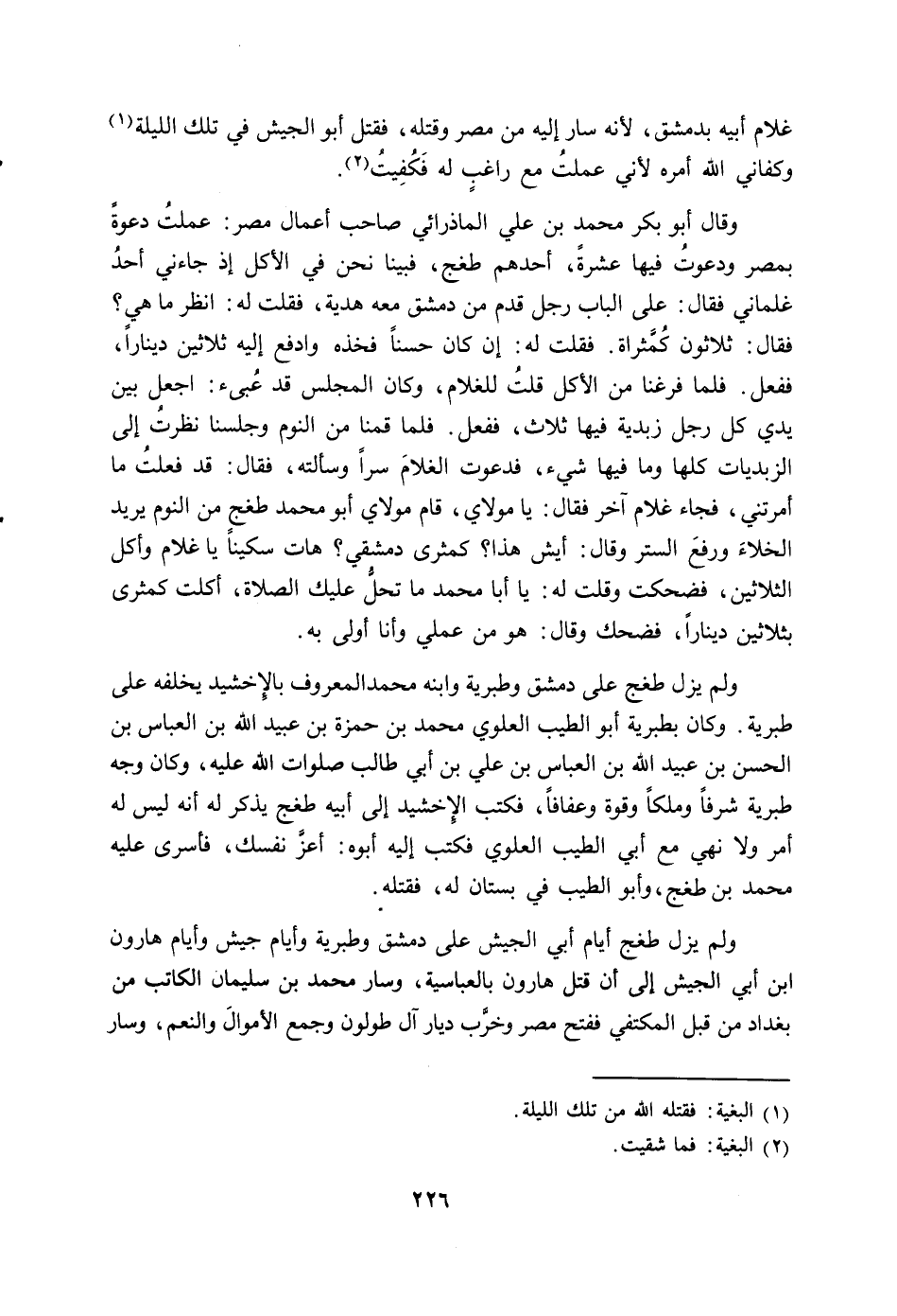 ولم يزل طغج أبام أبي الجيش على دمشق وطبرية وأيام جيش وأيام هارون ابن أبي الجيش إلى أن قتل هارون بالعباسية، وسار محمد بن سليمان الكاتب من بغداد من قبل المكتفي ففتح مصر وخرب ديار آل طولون وجمع الأموال والنعم، سار