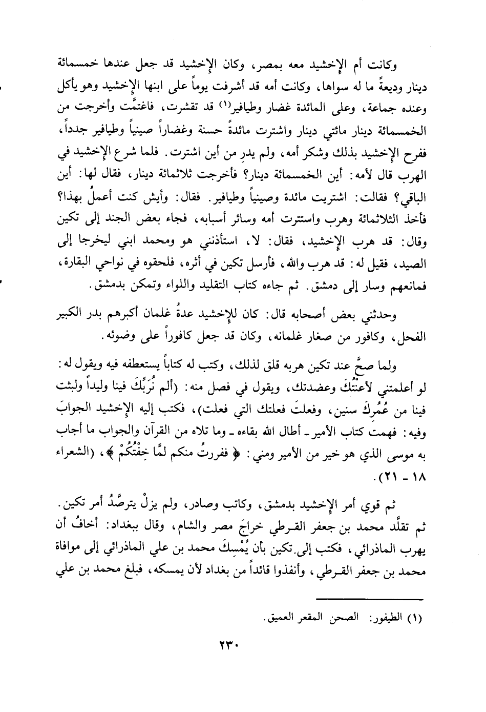 وكانت أم الإخشيد معه بمصر، وكان الإخشيد قد جعل عندها خمسمائة دينار وديعة ما له سواها، وكانت أمه قد أشرفت يوماً على ابنها الإخشيد وهو يأكل وعنده جماعة، وعلى المائدة غضار وطيافير (1) قد تقشرت، فاغتمت وأخرجت من الخمسمائة دينار مائتي دينار واشترت مائدة حسنة وغضاراً صينياً وطيافير جدداً، ففرح الإخشيد بذلك وشكر أمه، ولم يدر من أين أشترت. فلما شرع الإخشيد في الهرب قال لأمه: أين الخمسمائة دينار؟ فأخرجت ثلاثمائة دينار، فقال لها: أين الباقي؟ فقالت: اشتريت مائدة وصينياً وطيافير. فقال: وأيش كنت أعمل بهذا؟ فأخذ الثلاثمائة وهرب واستترت أمه وسائر أسبابه، فجاء بعض الجند إلى تكين وقال: قد هرب الإخشيد، فقال: لا، استأذنني هو ومحمد ابني ليخرجا إلى الصيد، فقيل له: قد هرب والله، فأرسل تكين في أثره، فلحقوه في نواحي البقارة، فمانعهم وسار إلى دمشق. ثم جاءه كتاب التقليد واللواء وتمكن بدمشق.