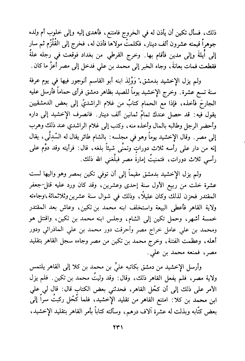 وأرسل الإخشيد من دمشق بكاتبه عليّ بن محمد بن كلا إلى القاهر يلتمس ولاية مصر، فلم يفعل القاهر ذلك، وقال: وقد وليت محمد بن تكين. فلم يزل الأمر على ذلك إلى أن كحل القاهر، فحدثني بعض الكتاب قال: قال لي عليّ ابن محمد بن كلا: امتنع القاهر من تقليد الإخشيد، فلما كحل ركبت سراً إلى بعض كتابه وبذلت له عشرة آلاف درهم، وسألته كتاباً بأمر القاهر بتقليد الإخشيد