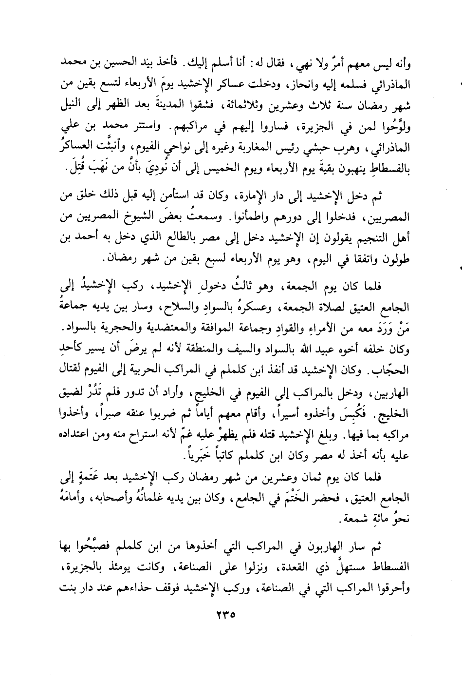 وأنه ليس معهم أمر ولا نهي، فقال له: أنا أسلم إليك. فأخذ بيد الحسين بن محمد الماذرائي فسلمه إليه وانحاز، ودخلت عساكر الإخشيد يوم الأربعاء لتسع بقين من شهر رمضان سنة ثلاث وعشرين وثلاثمائة، فشقوا المدينة بعد الظهر إلى النيل ولوحوا لمن في الجزيرة، فساروا إليهم في مراكبهم. واستتر محمد بن عليّ الماذرائي، وهرب حبشي رئيس المغاربة وغيره إلى نواحي الفيوم، وانبثت العساكر بالفسطاط ينهبون بقية يوم الأربعاء ويوم الخميس إلى أن نودي بأن من نهب قتل.