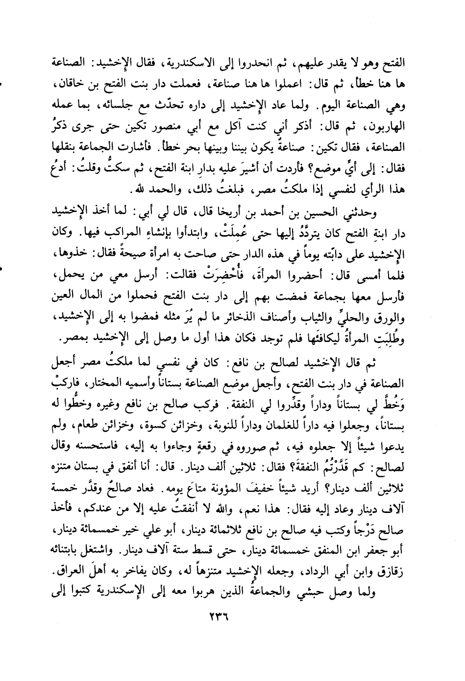 الفتح وهو لا يقدر عليهم، ثم انحدروا إلى الإسكندرية، فقال الإخشيد: الصناعة هاهنا خطأ، ثم قال: اعملوا هاهنا صناعة، فعملت دار بنت الفتح بن خاقان، وهي الصناعة اليوم. ولما عاد الإخشيد إلى داره تحدث مع جلسائه، بما عمله الهاربون، ثم قال: أذكر أني كنت آكل مع أبي منصور تكين حتى جرى ذكر الصناعة، فقال تكين: صناعة يكون بيننا وبينها بحر خطأ. فأشارت الجماعة بنقلها فقال: إلى أي موضع؟ فأردت أن أشير عليه بدار ابنة الفتح، ثم سكت وقلت: أدع هذا الرأي لنفسي إذا ملكت مصر، فبلغت ذلك، والحمد لله.