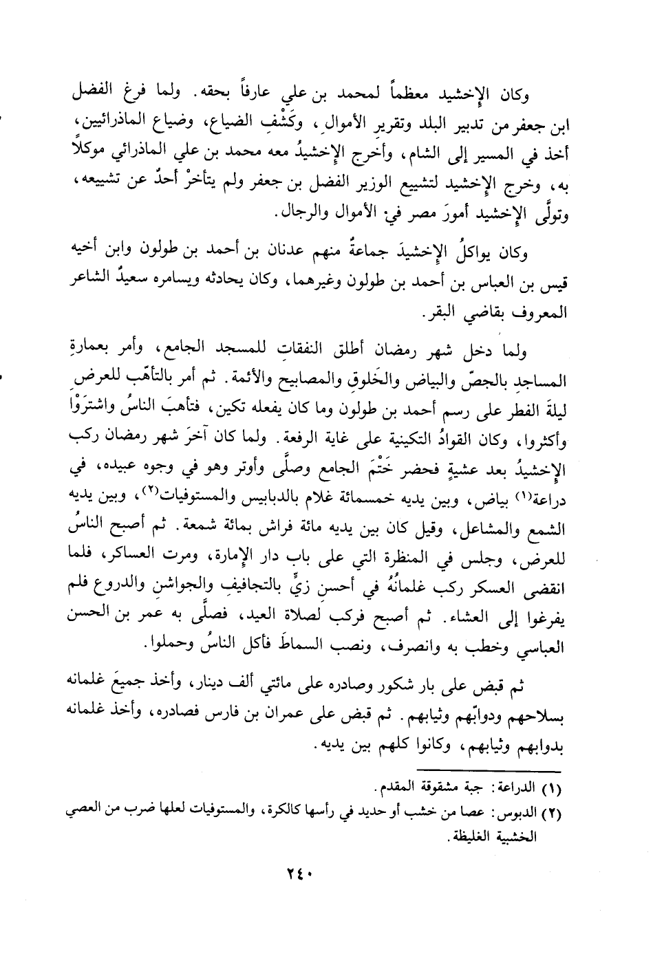 ولما دخل شهر رمضان أطلق النفقات للمسجد الجامع، وأمر بعمارة المساجد بالجص والبياض والخلوق والمصابيح والأئمة. ثم أمر بالتأهب للعرض ليلة الفطر على رسم أحمد بن طولون وما كان يفعله تكين، فتأهب الناس واشتروا وأكثروا، وكان القواد التكينية على غاية الرفعة. ولما كان آخر شهر رمضان ركب الإخشيد بعد عشية فحضر ختم الجامع وصلى وأوتر وهو في وجوه عبيده، في دراعة (1) بياض، وبين يديه خمسمائة غلام بالدبابيس والمستوفيات (2) ، وبين يديه الشمع والمشاعل، وقيل كان بين يديه مائة فراش بمائة شمعة. ثم أصبح الناس للعرض، وجلس في المنظرة التي على باب الإمارة، ومرت العساكر، فلما انقضى العسكر ركب غلمانه في أحسن زي بالتجافيف والجواشن والدروع فلم يفرغوا إلى العشاء. ثم أصبح فركب لصلاة العيد، فصلى به عمر بن الحسن العباسي وخطب به وانصرف، ونصب السماط فأكل الناس وحملوا.