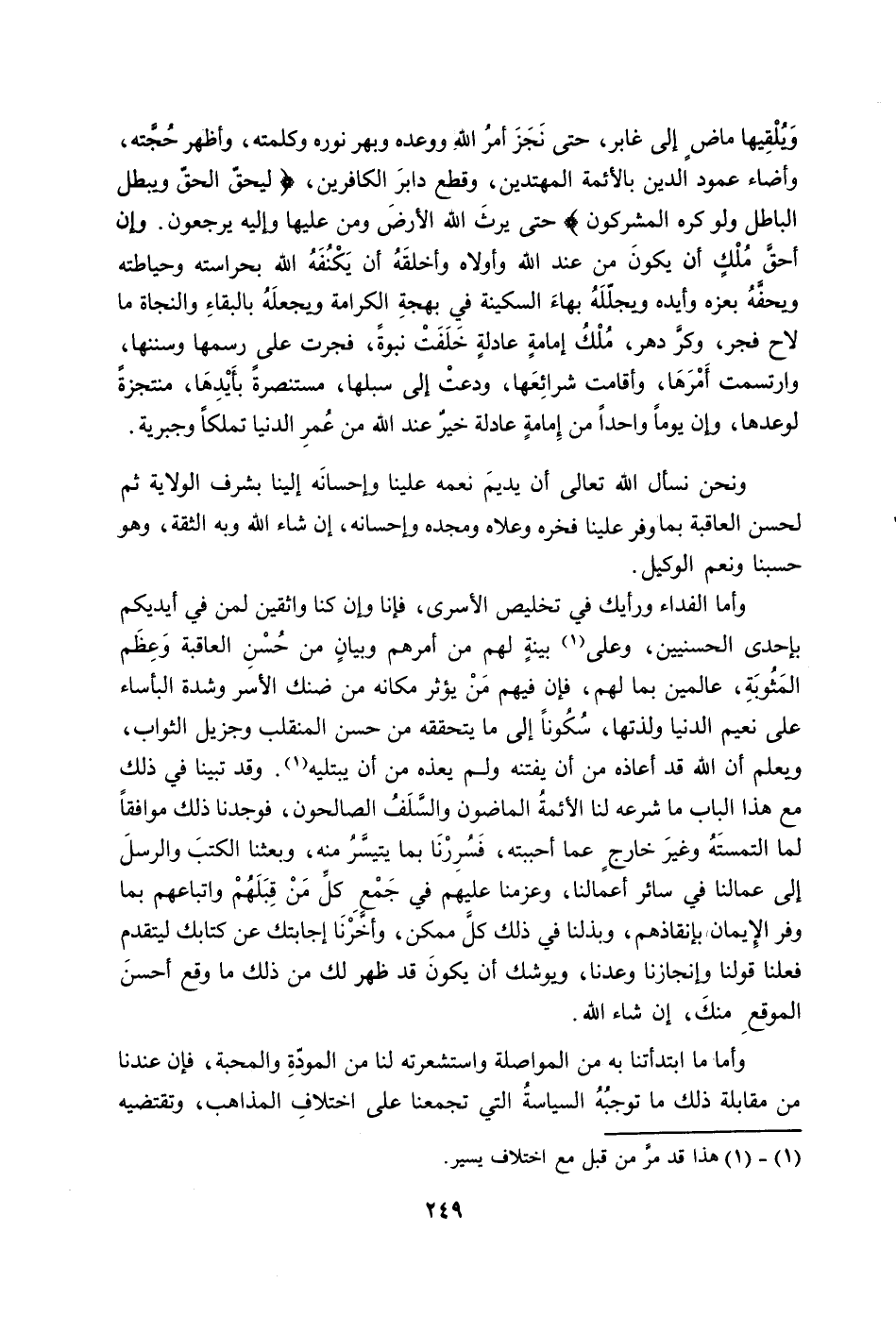 وأما ما ابتدأتنا به من المواصلة واستشعرته لنا من المودة والمحبة، فإن عندنا من مقابلة ذلك ما توجبه السياسة التي تجمعنا على اختلاف المذاهب، وتقتضيه