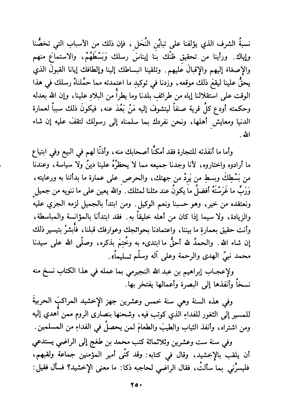 نسبة الشرف الذي يؤلفنا على تباين النحل، فإن ذلك من الأسباب التي تخصنا وإياك. ورأينا من تحقيق ظنك بنا إيناس رسلك وبسطهم، والاستماع منهم والإصغاء إليهم والإقبال عليهم. وتلقينا انبساطك إلينا وإلطافك إيانا القبول الذي يحق علينا ليقع ذلك موقعه، وزدنا في توكيد ما اعتمدته مما حملناه رسلك في هذا الوقت على استقلالنا إياه من طرائف بلدنا وما يطرأ من البلاد علينا، وإن الله بعدله وحكمته أودع كل قرية صنفاً ليتشوف إليه من بعد عنه، فيكون ذلك سبباً لعمارة الدنيا ومعايش أهلها، ونحن نفردك بما سلمناه إلى رسولك لتقف عليه إن شاء الله.