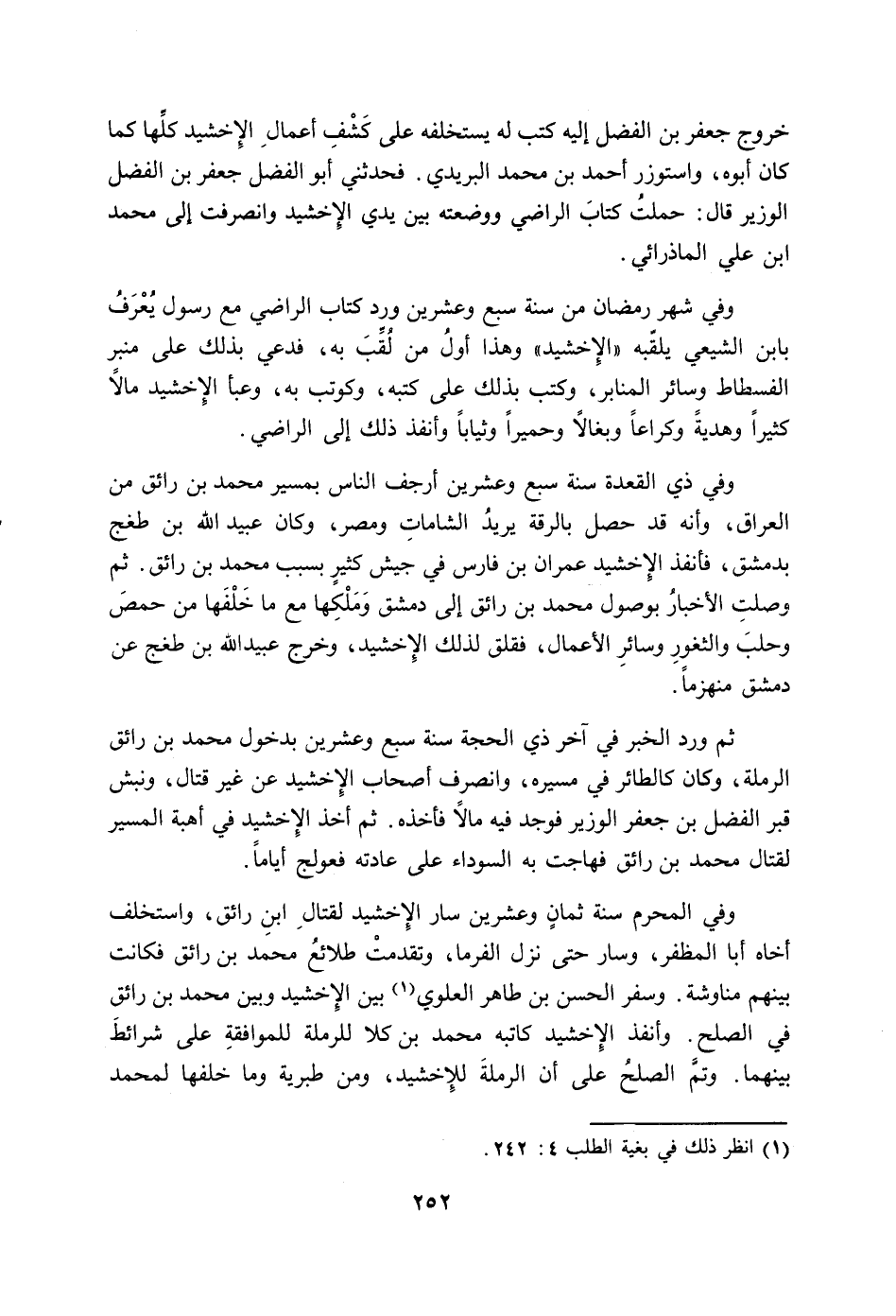 خروج جعفر بن الفضل إليه كتب له يستخلفه على كشف اعمال الإخشيد كلها كما كان أبوه، واستوزر أحمد بن محمد البريدي. فحدثني أبو الفضل جعفر بن الفضل الوزير قال: حملت كتاب الراضي ووضعته بين يدي الإخشيد وانصرفت إلى محمد ابن عليّ الماذرائي.