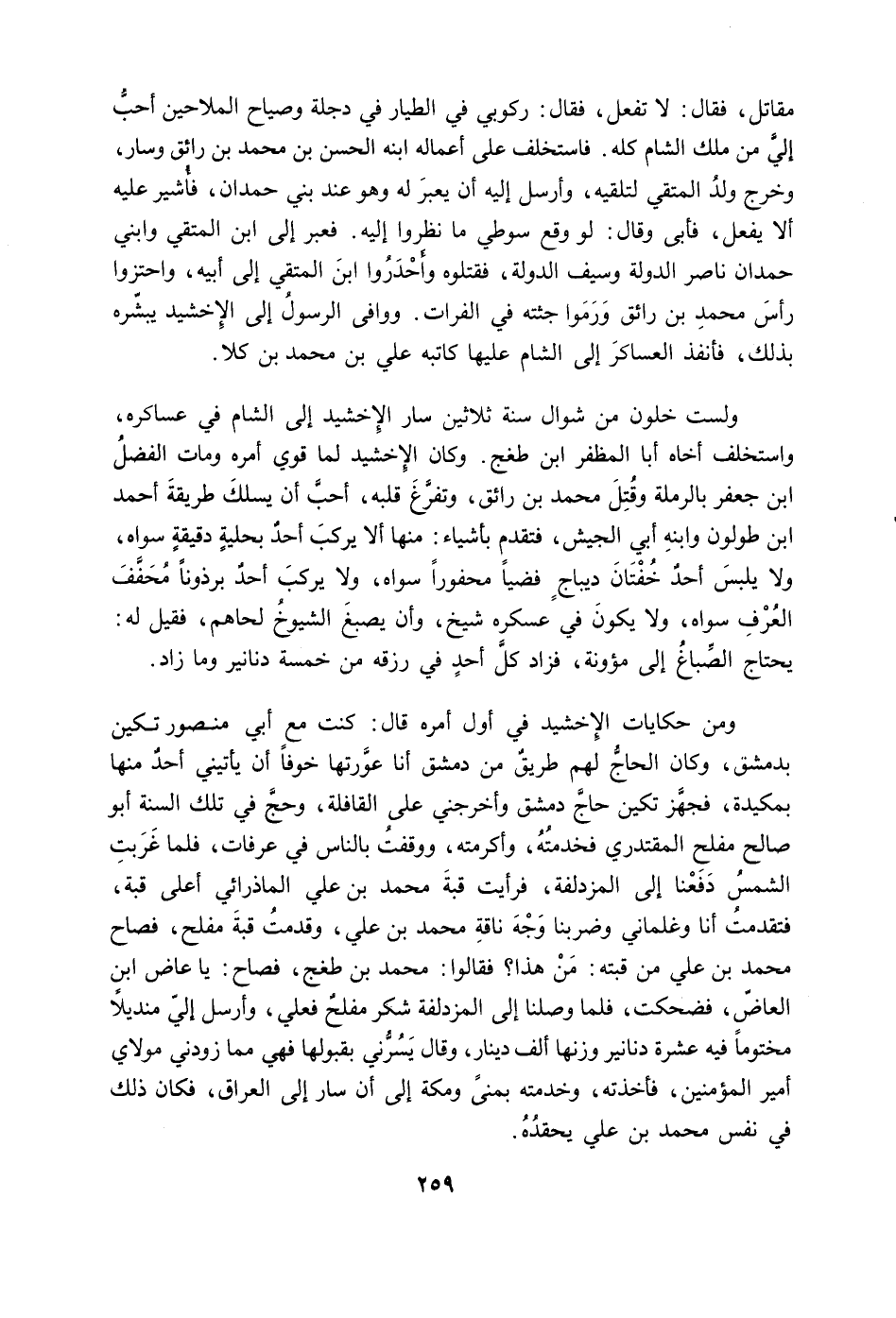 مقاتل، فقال: لا تفعل، فقال: ركوبي في الطيار في دجلة وصياح الملاحين أحب إلي من ملك الشام كله. فاستخلف على أعماله ابنه الحسن بن محمد بن رائق وسار، وخرج ولد المتقي لتلقيه، وأرسل إليه أن يعبر له وهو عند بني حمدان، فأشير عليه ألا يفعل، فأبى وقال: لو وقع سوطي ما نظروا إليه. فعبر إلى ابن المتقي وابني حمدان ناصر الدولة وسيف الدولة، فقتلوه وأحدروا ابن المتقي إلى أبيه، واحتزوا رأس محمد بن رائق ورموا جثته في الفرات. ووافى الرسول إلى الإخشيد يبشره بذلك، فأنفذ العساكر إلى الشام عليها كاتبه عليّ بن محمد بن كلا.