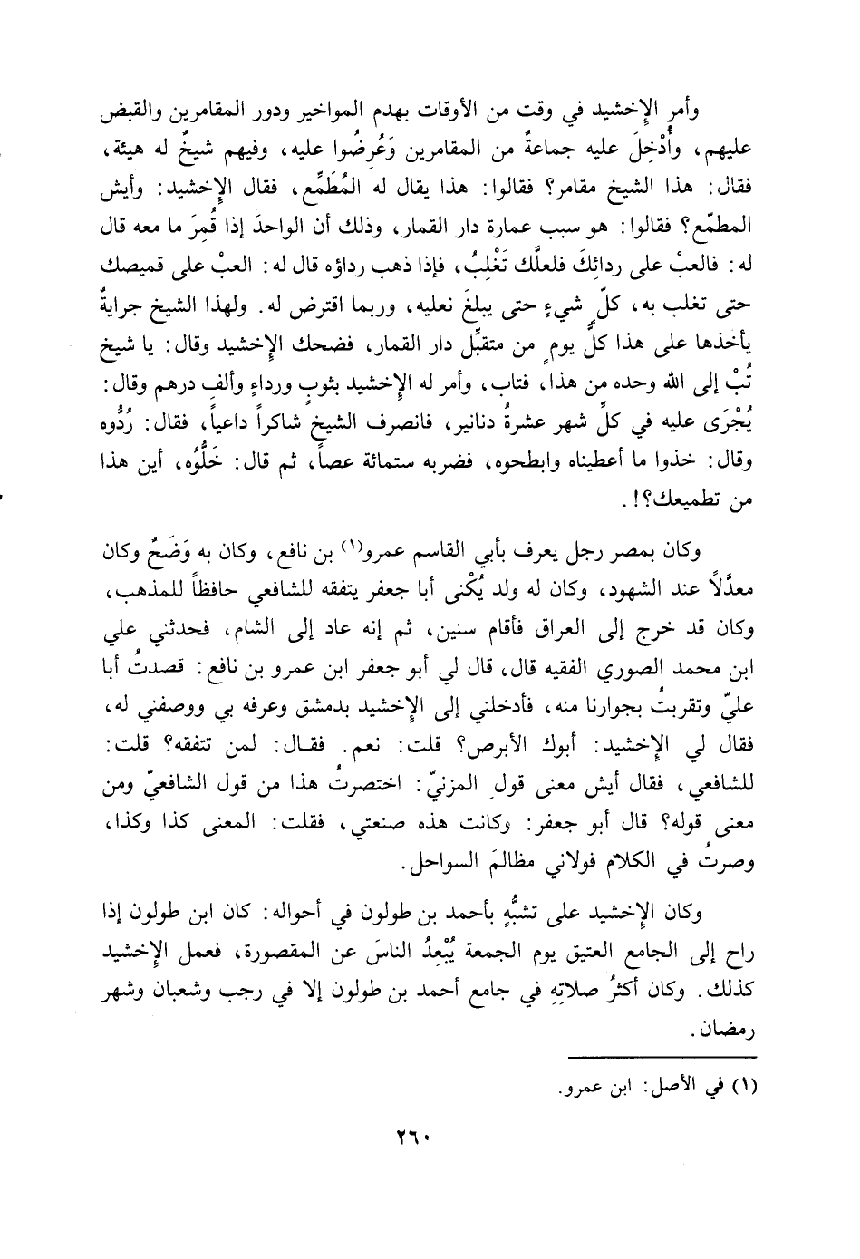 وكلن بمصر رجل يعرف بأبي القاسم عمرو بن نافع، وكان به وضح وكان معدلاً عند الشهود، وكان له ولد يكنى أبا جعفر يتفقه للشافعي حافظاً للمذهب، وكان قد خرج إلى العراق فأقام سنين، ثم إنه عاد إلى الشام، فحدثني عليّ ابن محمد الصوري الفقيه قال، قال لي أبو جعفر ابن عمرو بن نافع: قصدت أبا عليّ وتقربت بجوارنا منه، فأدخلني إلى الإخشيد بدمشق وعرفه بي ووصفني له، فقال لي الإخشيد: أبوك الأبرص؟ قلت: نعم. فقال: لمن تتفقه؟ قلت: للشافعي، فقال أيش معنى قول المزني: اختصرت هذا من قول الشافعي ومن معنى قوله؟ قال أبو جعفر: وكانت هذه صنعتي، فقلت: المعنى كذا وكذا، وصرت في الكلام فولاني مظالم السواحل.