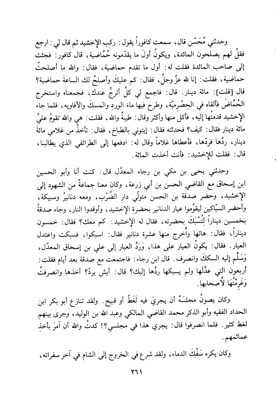 وحدثني يحيى بن مكي بن رجاء المعدل قال: كنت أنا وأبو الحسين ابن إسحاق مع القاضي الحسن بن أبي زرعة، وكان معنا جماعة من الشهود إلى الإخشيد، وحضر صدقة بن الحسن متولي دار الضرب، ومعه دنانير وسبيكة، وأحضر السباكين ليقوموا عيار الدنانير بحضرة الإخشيد، وأوقدوا النار، وجاء صدقة بخمسين ديناراً لتسبك بحضرته، فقال له الإخشيد: كم معك؟ فقال: خمسون ديناراً، فقال: هاتها وأخرج منها عشرة دنانير فقال: اسبكوا، فسبكت وأعتدل العيار. فقال: يكون العيار على هذا، ورد العيار إلى عليّ بن إسحاق المعدل، وسلم إليه السكك وانصرف. قال ابن رجاء: فاجتمعت مع صدقة بعد أيام فقلت: أربعون التي عدلها ولم يسبكها ردها إليك؟ قال: أيش يرد؟ أخذها وانصرفت وغرمتها لأصحابها.