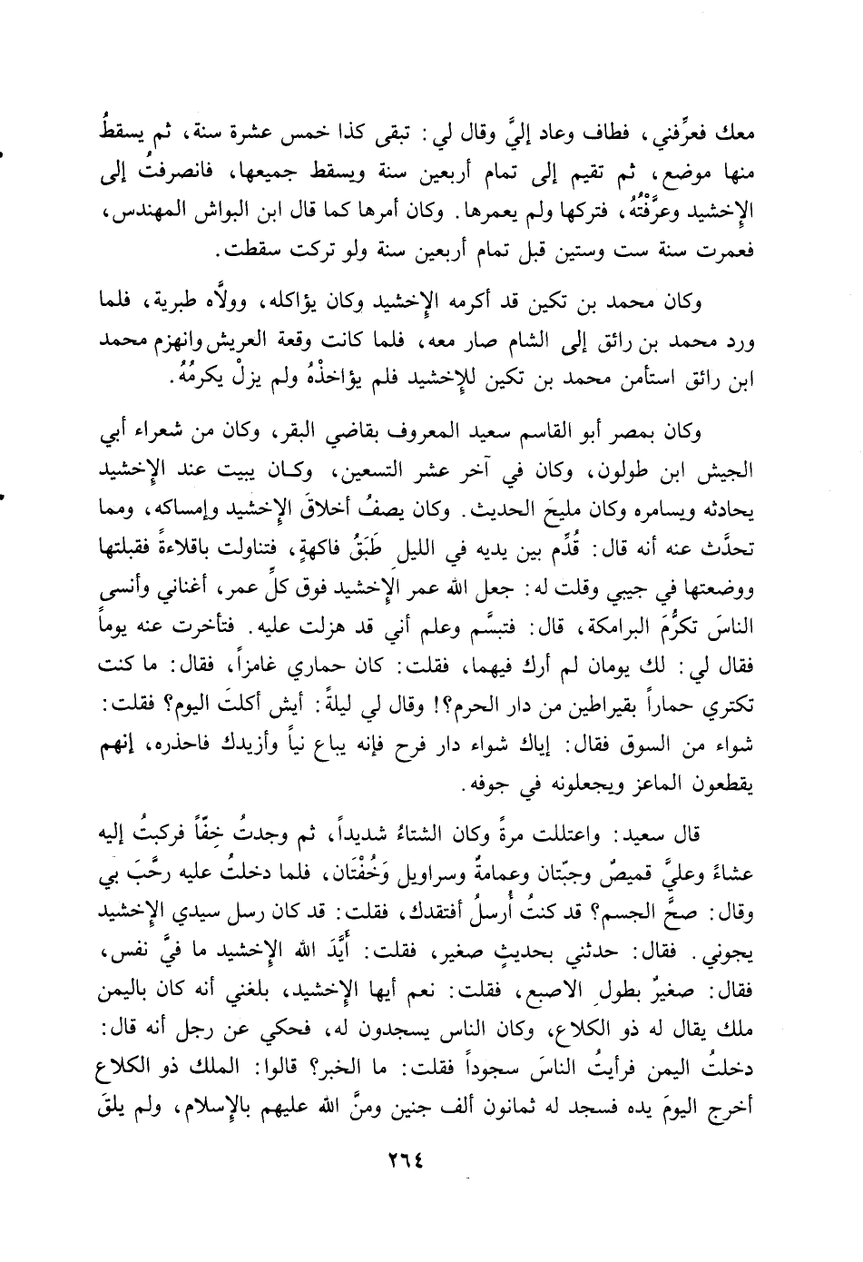قال سعيد: واعتللت مرة وكان الشتاء شديداً، ثم وجدت خفاً فركبت إليه عشاءً وعلي قميص وجبتان وعمامة وسراويل وخفتان، فلما دخلت عليه رحب بي وقال: صح الجسم؟ قد كنت أرسل أفتقدك، فقلت: قد كان رسل سيدي الإخشيد يجوني. فقال: حدثني بحديث صغير، فقلت: أيد الله الإخشيد ما في نفس، فقال: صغير بطول الإصبع، فقلت: نعم أيها الإخشيد، بلغني أنه كان باليمن ملك يقال له ذو الكلاع، وكان الناس يسجدون له، فحكي عن رجل أنه قال: دخلت اليمن فرأيت الناس سجوداً فقلت: ما الخبر؟ قالوا: الملك ذو الكلاع أخرج اليوم يده فسجد له ثمانون ألف جنين ومن الله عليهم بالإسلام، ولم يلق
