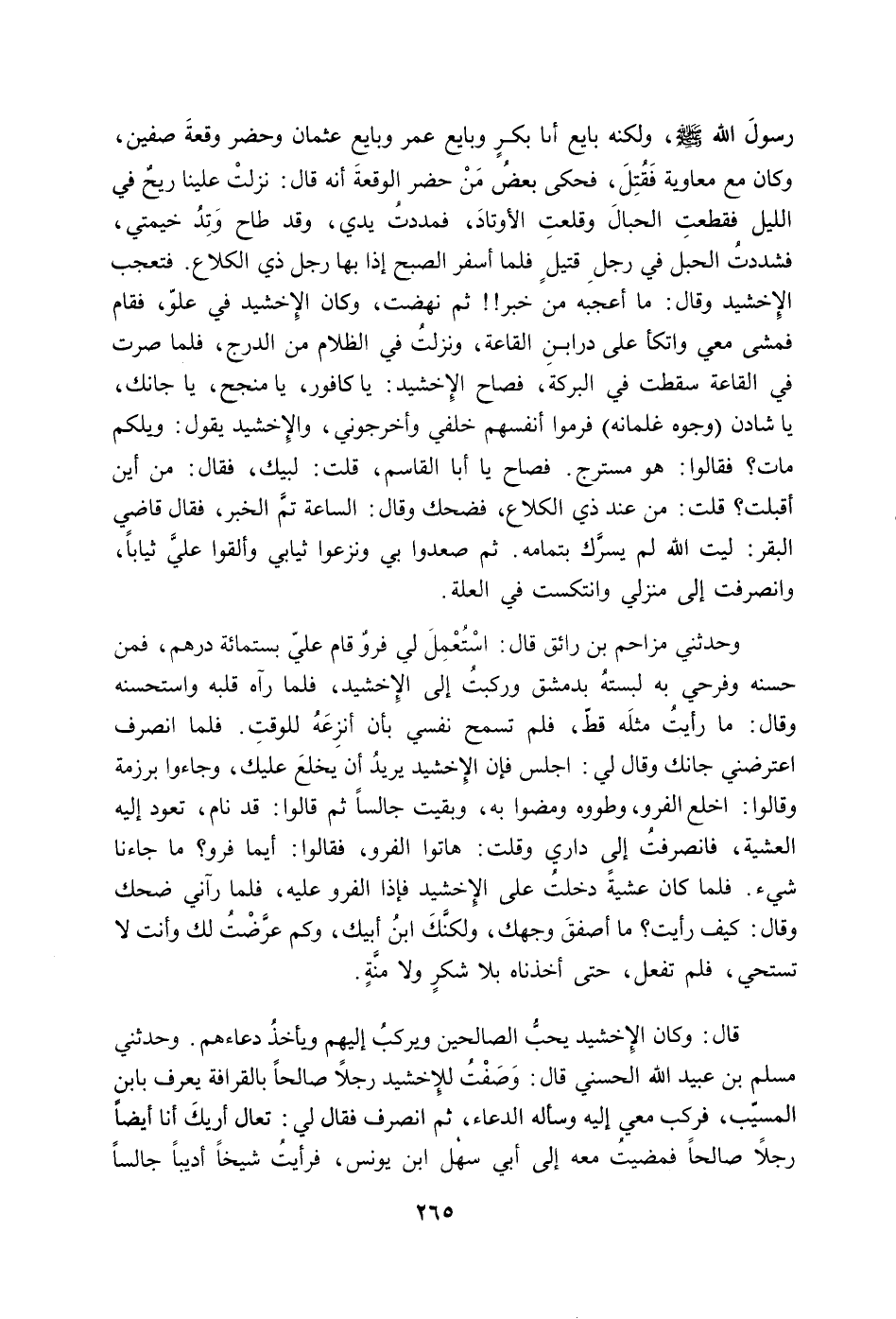رسول الله صلى الله عليه وسلم، ولكنه بايع أبا بكر وبايع عمر وبايع عثمان وحضر وقعة صفين، وكان مع معاوية فقتل، فحكى بعض من حضر الوقعة أنه قال: نزلت علينا ريح في الليل فقطعت الحبال وقلعت الأوتاد، فمددت يدي، وقد طاح وتد خيمتي، فشددت الحبل في رجل قتيل فلما أسفر الصبح إذا بها رجل ذي الكلاع. فتعجب الإخشيد وقال: ما أعجبه من خبر! ! ثم نهضت، وكان الإخشيد في علو، فقام فمشى معي واتكأ على درابن القاعة، ونزلت في الظلام من الدرج، فلما صرت في القاعة سقطت في البركة، فصاح الإخشيد: يا كافور، يا منجح، يا جانك، يا شادن (وجوه غلمانه) فرموا أنفسهم خلفي وأخرجوني، والإخشيد يقول: ويلكم مات؟ فقالوا: هو مسترج. فصاح يا أبا القاسم، قلت: لبيك، فقال: من أين أقبلت؟ قلت: من عند ذي الكلاع، فضحك وقال: الساعة تم الخبر، فقال قاضي البقر: ليت الله لم يسرك بتمامه. ثم صعدوا بي ونزعوا ثيابي وألقوا عليّ ثياباً، وانصرفت إلى منزلي وانتكست في العلة.