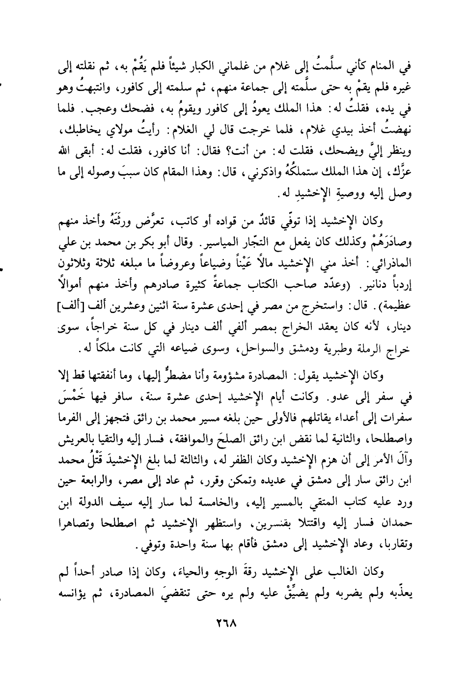 وكان الإخشيد إذا توفي قائد من قواده أو كاتب، تعرض ورثته وأخذ منهم وصادرهم وكذلك كان يفعل مع التجار المياسير. وقال أبو بكر بن محمد بن عليّ الماذرائي: أخذ مني الإخشيد مالاً عيناً وضياعاً وعروضاً ما مبلغه ثلاثة وثلاثون إردباً دنانير. (وعدد صاحب الكتاب جماعة كثيرة صادرهم وأخذ منهم أموالاً عظيمة) . قال: واستخرج من مصر في إحدى عشرة سنة اثنين وعشرين ألف [ألف] دينار، لأنه كان يعقد الخراج بمصر ألفي ألف دينار في كل سنة خراجاً، سوى خراج الرملة وطبرية ودمشق والسواحل، وسوى ضياعه التي كانت ملكاً له.