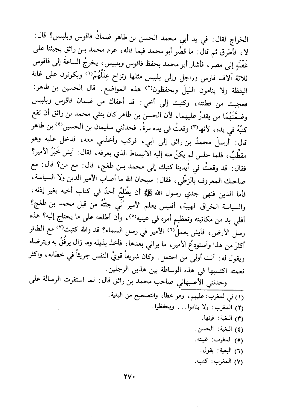 الخراج فقال: في يد أبي محمد الحسن بن طاهر ضمان فاقوس وبلبيس؟ قال: لا، فأطرق ثم قال: ما قصر أبو محمد فيما قاله، عزم محمد بن رائق يجيئنا على غفلة إلى مصر، فأشار أبو محمد بحفظ فاقوس وبلبيس، يخرج الساعة إلى فاقوس ثلاثة آلاف فارس وراجل وإلى بلبيس مثلها وتزاح عللهم (1) ويكونون على غاية اليقظة ولا ينامون الليل ويحفظون (2) هذه المواضع. قال الحسين بن طاهر: فعجبت من فطنته، وكتبت إلى أخي: قد أعفاك من ضمان فاقوس وبلبيس وضمنهما من يقدر عليهما، لأن الحسن بن طاهر كان يتقي محمد بن رائق أن تقع كتبه في يده، لأنها (3) وقعت في يده مرة، فحدثني سليمان بن الحسين (4) بن طاهر قال: أرسل محمد بن رائق إلى أبي، فركب وأخذني معه، فدخل عليه وهو مقطب، فلما جلس لم يكن منه إليه الانبساط الذي يعرفه، فقال: أيش خبر الأمير؟ فقال: قد وقعت في أيدينا كتبك إلى محمد بن طغج، قال: مع من؟ قال: مع صاحبك المعروف بالزطي، فقال: سبحان الله ما أصاب الأمير الدين ولا السياسة، فأما الدين فنهى جدي رسول الله صلى الله عليه وسلم أن يطلع أحد في كتاب أخيه بغير إذنه، والسياسة انخراق الهيبة، أفليس يعلم الأمير أني جئته من قبل محمد بن طغج؟ أفلي بد من مكاتبته وتعظيم أمره في عينيه (5) ، وأن أطلعه على ما يحتاج إليه؟ هذه رسل الأرض، فأيش يعمل (6) الأمير في رسل السماء؟ قد والله كتبت (7) مع الطائر أكثر من هذا وأستودع الأمير، ما يراني بعدها، فأخذ بذيله وما زال يرفق به ويترضاه ويقول له: أنت أولى من احتمل. وكان شريفاً قوي النفس جريئاً في خطابه، وأكثر نعمته اكتسبها في هذه الوساطة بين هذين الرجلين.