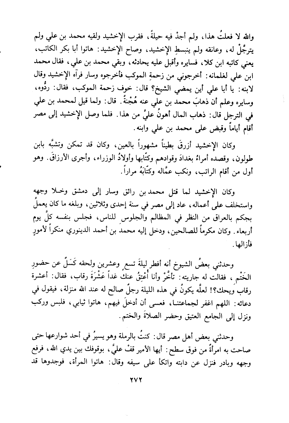والله لا فعلت هذا، ولم أجد فيه حيلة، فقرب الإخشيد ولقيه محمد بن عليّ ولم يترجل له، وعانقه ولم ينبسط الإخشيد، وصاح الإخشيد: هاتوا أبو بكر الكاتب، يعني كاتبه ابن كلا، فسايره وأقبل عليه يحادثه، وبقي محمد بن علي، فقال محمد ابن عليّ لغلمانه: أخرجوني من زحمة الموكب فأخرجوه وسار فرآه الإخشيد وقال لابنه: يا أبا عليّ أين يمضي الشيخ؟ قال: خوف زحمة الموكب، فقال: ردوه، وسايره وعلم أن ذهاب محمد بن عليّ عنه هجنة. قال: ولما قيل لمحمد بن عليّ في الترجل قال: ذهاب المال أهون عليّ من هذا. فلما وصل الإخشيد إلى مصر أقام أياماً وقبض على محمد بن عليّ وابنه.