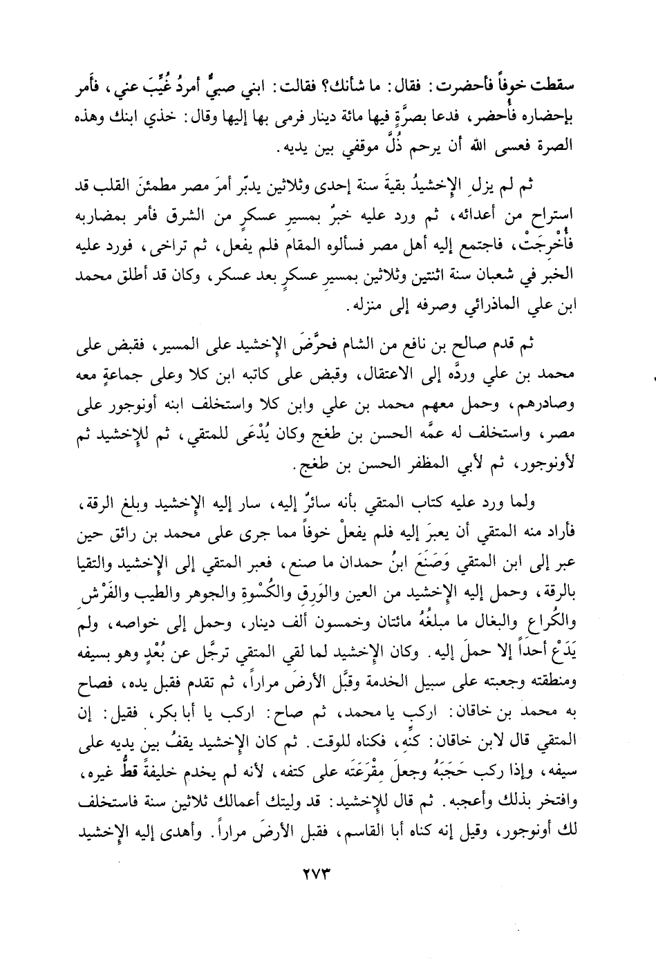 ولما ورد عليه كتاب المتقي بأنه سائر إليه، سار إليه الإخشيد وبلغ الرقة، فأراد منه المتقي أن يعبر إليه فلم يفعل خوفاً مما جرى على محمد بن رائق حين عبر إلى ابن المتقي وصنع ابن حمدان ما صنع، فعبر المتقي إلى الإخشيد والتقيا بالرقة، وحمل إليه الإخشيد من العين والورق والكسوة والجوهر والطيب والفرش والكراع والبغال ما مبلغه مائتان وخمسون ألف دينار، وحمل إلى خواصه، ولم يدع أحداً إلا حمل إليه. وكان الإخشيد لما لقي المتقي ترجل عن بعد وهو بسيفه ومنطقته وجعبته على سبيل الخدمة وقبل الأرض مراراً، ثم تقدم فقبل يده، فصاح به محمد بن خاقان: اركب يا محمد، ثم صاح: أركب يا أبا بكر، فقيل: إن المتقي قال لابن خاقان: كنه، فكناه للوقت. ثم كان الإخشيد يقف بين يديه على سيفه، وإذا ركب حجبه وجعل مقرعته على كتفه، لأنه لم يخدم خليفة قط غيره، وافتخر بذلك وأعجبه. ثم قال للإخشيد: قد وليتك أعمالك ثلاثين سنة فاستخلف لك أونوجور، وقيل إنه كناه أبا القاسم، فقبل الأرض مراراً. وأهدى إليه الإخشيد