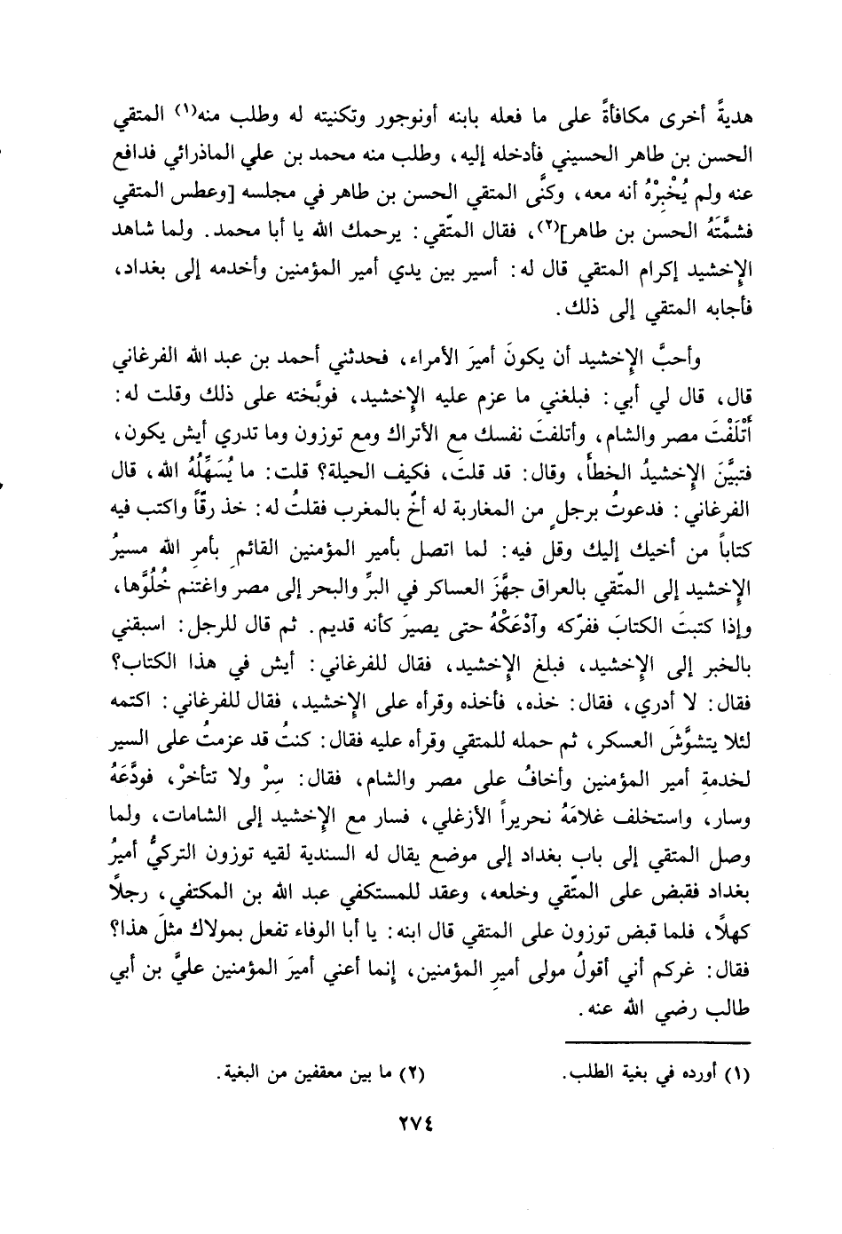 هدية أخرى مكافأة على ما فعله بابنه أونوجور وتكنيته له وطلب منه (1) المتقي الحسن بن طاهر الحسيني فادخله إليه، وطلب منه محمد بن علي الماذرائي فدافع عنه ولم يخبره أنه معه، وكنى المتقي الحسن بن طاهر في مجلسه [وعطس المتقي فشمته الحسن بن طاهر] (2) ، فقال المتقي: يرحمك الله يا أبا محمد. ولما شاهد الإخشيد إكرام المتقي قال له: أسير بين يدي أمير المؤمنين وأخدمه إلى بغداد، فأجابه المتقي إلى ذلك.