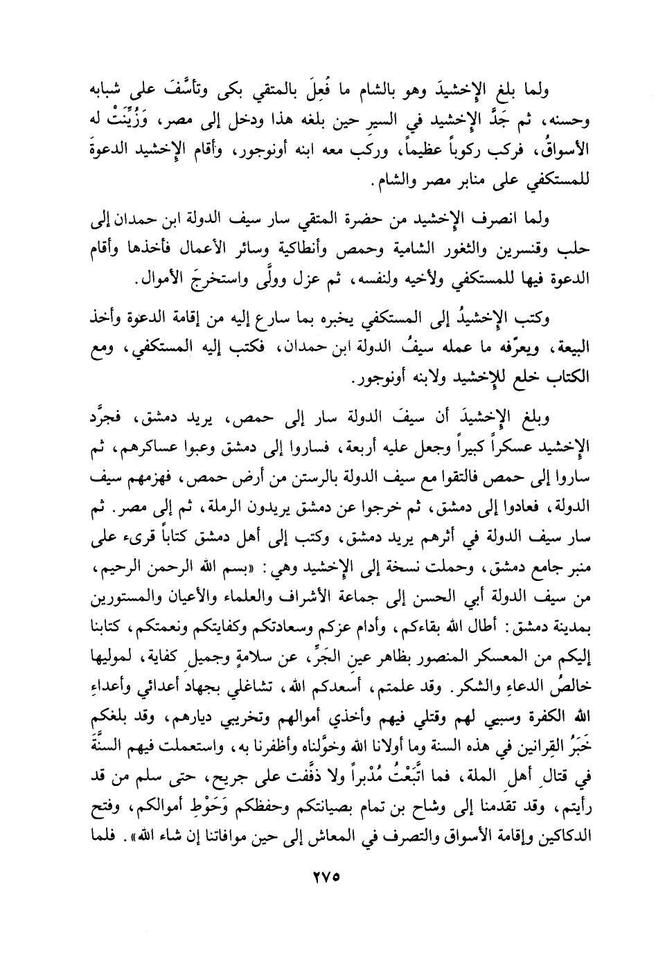 ولما بلغ الإخشيد وهو بالشام ما فعل بالمتقي بكى وتأسف على شبابه وحسنه، ثم جد الإخشيد في السير حين بلغه هذا ودخل إلى مصر، وزينت له الأسواق، فركب ركوبا عظيما، وركب معه ابنه أونوجور، وأقام الإخشيد الدعوة للمستكفي على منابر مصر والشام.