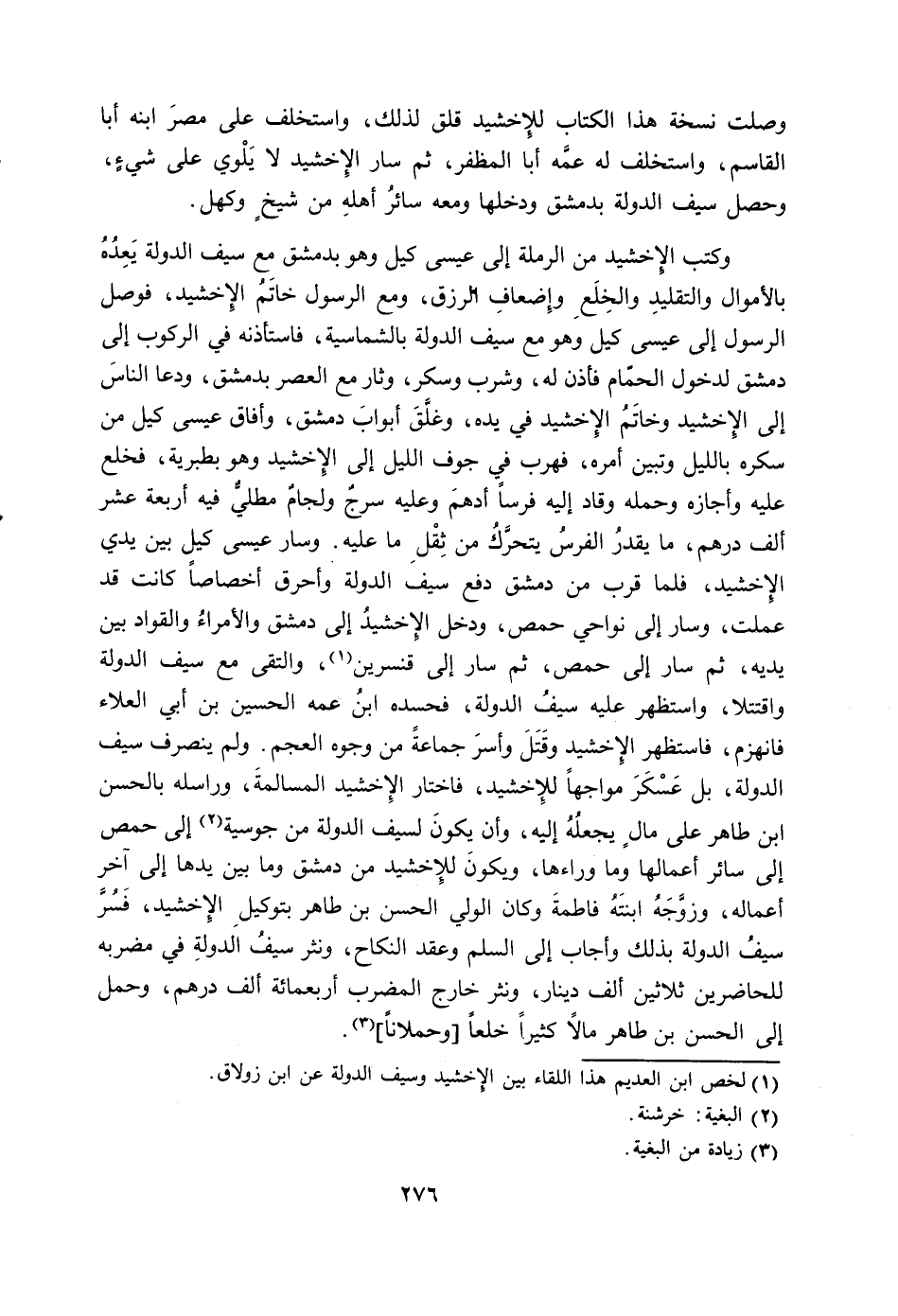 (1) لخص ابن العديم هذا اللقاء بين الإخشيد وسيف الدولة عن ابن زولاق.