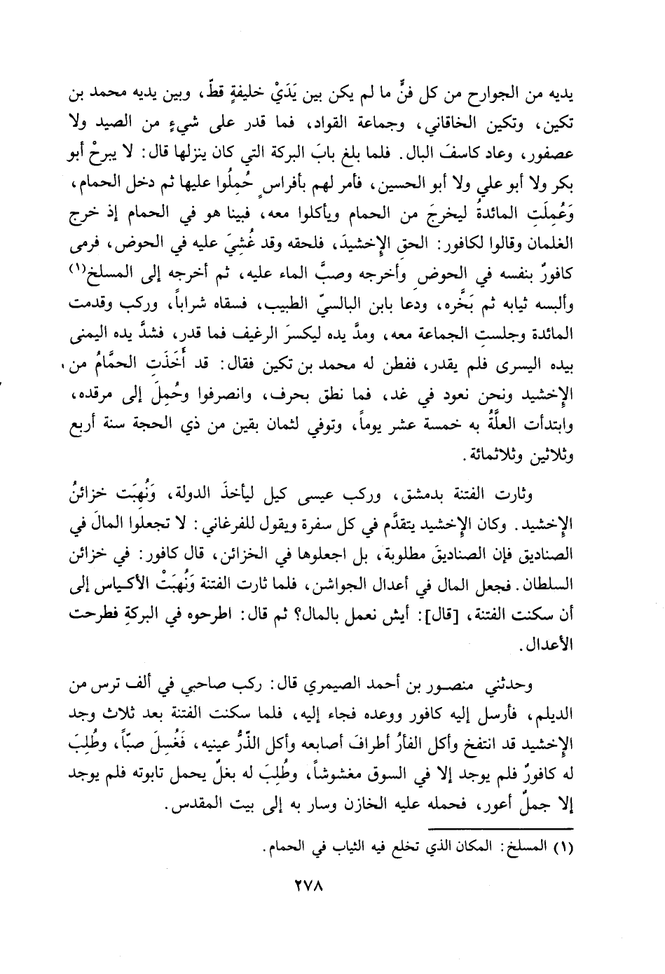 وثارت الفتنة بدمشق، وركب عيسى كيل ليأخذ الدولة، ونهبت خزائن الإخشيد. وكان الإخشيد يتقدم فى كل سفرة ويقول للفرغاني: لا تجعلوا المال في الصناديق فإن الصناديق مطلوبة، بل اجعلوها في الخزائن، قال كافور: في خزائن السلطان. فجعل المال في أعدال الجواشن، فلما ثارت الفتنة ونهبت الأكياس إلى أن سكنت الفتنه، [قال] : أيش نعمل بالمال؟ ثم قال: اطرحوه في البركة فطرحت الأعدال.