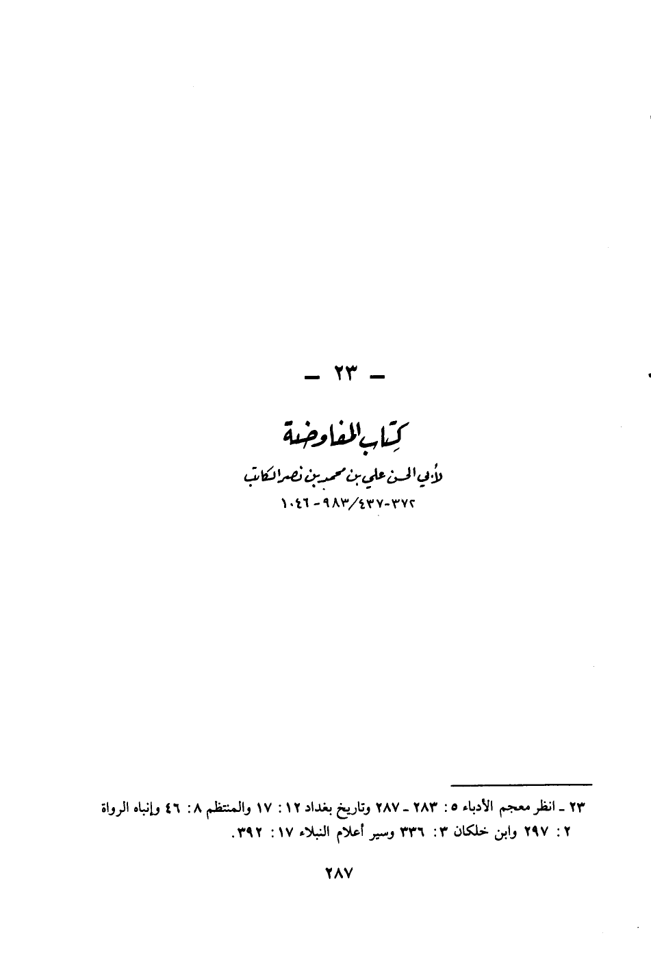 (1) انظر معجم الأدباء 5: 283 - 287 وتاريخ بغداد 12: 17 والمنتظم 8: 46 وإنباه الرواة 2: 297 وابن خلكان 3: 336 وسير أعلام النبلاء 17: 392.