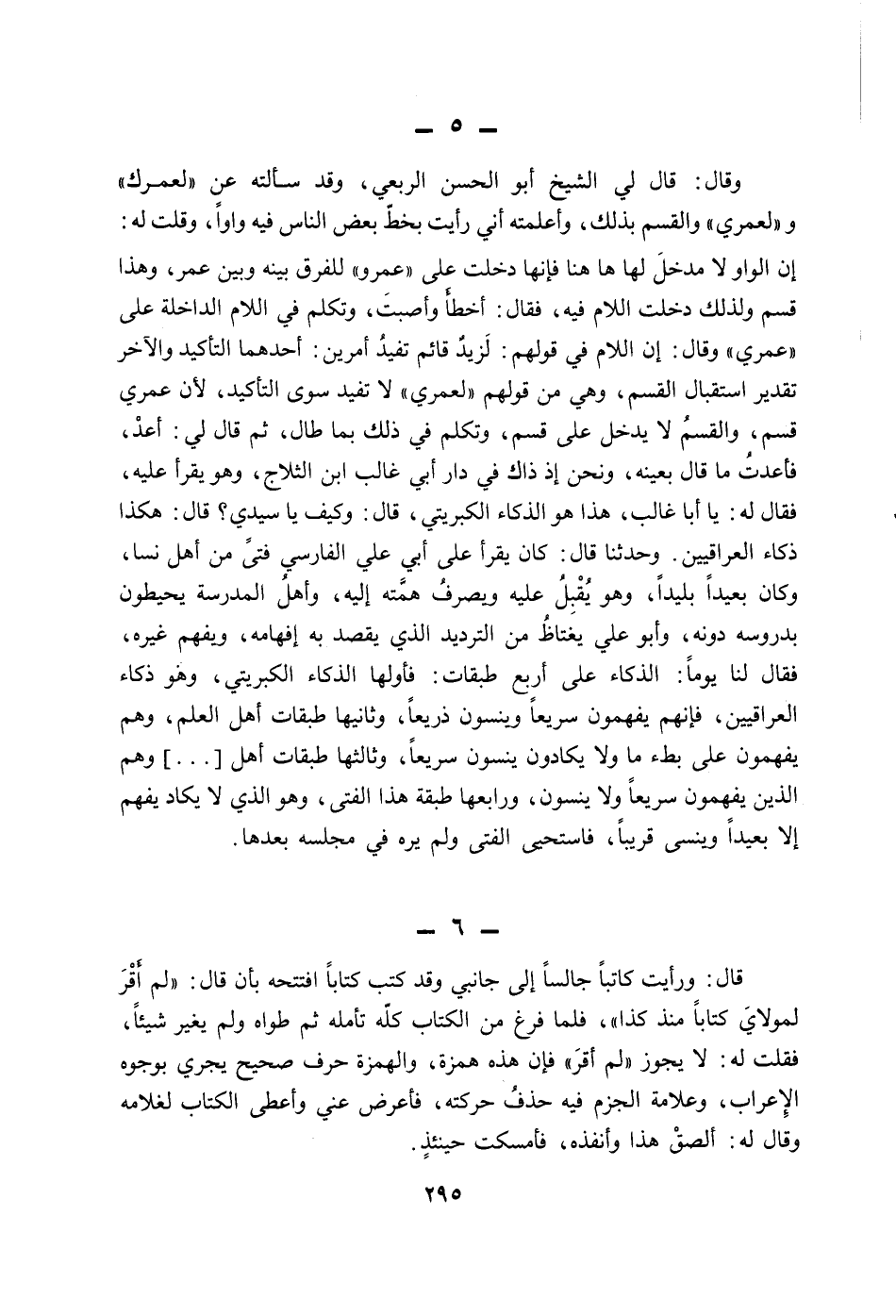 وقال: قال لي الشيخ أبو الحسن الربعي، وقد سألته عن " لعمرك " و " لعمري " والقسم بذلك، وأعلمته أني رأيت بخط بعض الناس فيه واوا، وقلت له: إن الواو لا مدخل لها ها هنا فإنها دخلت على " عمرو " للفرق بينه وبين عمر، وهذا قسم ولذلك دخلت اللام فيه، فقال أخطأ وأصبت، وتكلم في اللام الداخلة على " عمري " وقال: إن اللام في قولهم: لزيد قائم تفيد أمرين: أحدهما التأكيد والآخر تقدير استقبال القسم، وهى من قولهم " لعمري " لا تفيد سوى التأكيد، لأن عمري قسم، والقسم لا يدخل على قسم، وتكلم في ذلك بما طال، ثم قال لي: أعد، فأعدت ما قال بعينه، ونحن إذ ذاك في دار أبي غالب ابن الثلاج، وهو يقرأ عليه، فقال له: يا أباغالب، هذا هو الذكاء الكبريتي، قال: وكيف يا سيدي؟ قال: هكذا ذكاء العرقيين. وحدثنا قال: كان يقرأ على أبي علي الفارسي فتى من أهل نسا، وكان بعيدا بليدا، وهو يقبل عليه ويصرف همته إليه، وأهل المدرسة يحيطون بدروسه دونه، وأبو علي يغتاظ من الترديد الذي يقصد به إفهامه، ويفهم غيره، فقال لنا يوما: الذكاء على أربع طبقات: فأولها الذكاء الكبريتي، وهو ذكاء العراقيين، فإنهم يفهمون سريعا وينسون ذريعا، وثانيها طبقات أهل العلم، وهم يفهمون على بطء ما ولا يكادون ينسون سريعا، وثالثها طبقات أهل [؟] وهم الذين يفهمون سريعا ولا ينسون، ورابعها طبقه هذا الفتى، وهو الذي لا يكاد يفهم إلا بعيدا وينسى قريبا، فاستحيى الفتى ولم يره في مجلسه بعدها.
