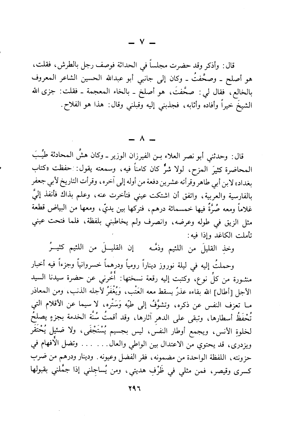 وخذ القليل من اللئيم وذمه ... إن القليل من اللئيم كثير وحملت إليه في ليلة نوروز دينارا روميا ودرهما خسروانيا وجزءا فيه أخبار منشورة من كل نوع، وكتبت إليه رقعة نسختها: أخرني عن حضرة سيدنا السيد الأجل [أطال] الله بقاءه عذر يسقط معه العتب، ويغفر لأجله الذنب، ومن المعاذر ما تعزف النفس عن ذكره، وتشوف إلى طيه وستره، لاسيما عن الأقلام التي تحفظ أسطارها، وتبقى على الدهر آثارها، وقد أقمت سنة الخدمة بجزء يصلح لخلوة الأنس، ويجمع أوطار النفس، ليس بجسيم يستجفى ولا ضئيل يحتقر ويزدرى، قد يحتوى من الاعتدال بين الواطي والعال؟ ؟ وتضل الأفهام في حزونته اللفظة الواحدة من مضمونه فقر الفضل وعيونه. ودينار ودرهم من ضرب كسرى وقيصر، فمن مثلي في ظرف هديتي، ومن يساجلني إذا جملني بقبولها