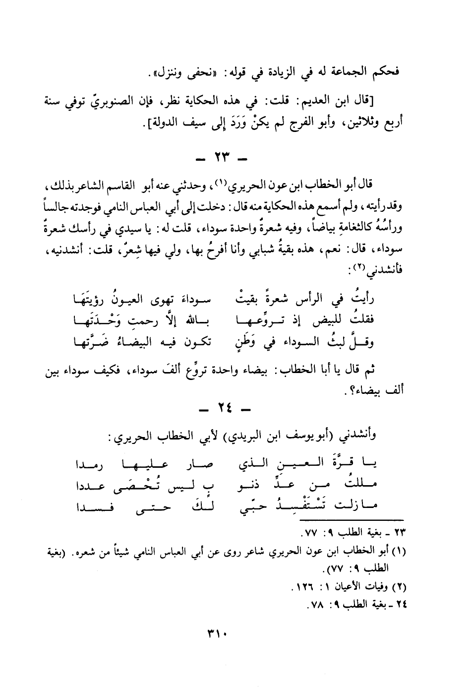 (2) أبو الخطاب ابن عون الحريري شاعر روى عن أبي العباس النامي شيئاً من شعره. (بغية الطلب 9: 77) .