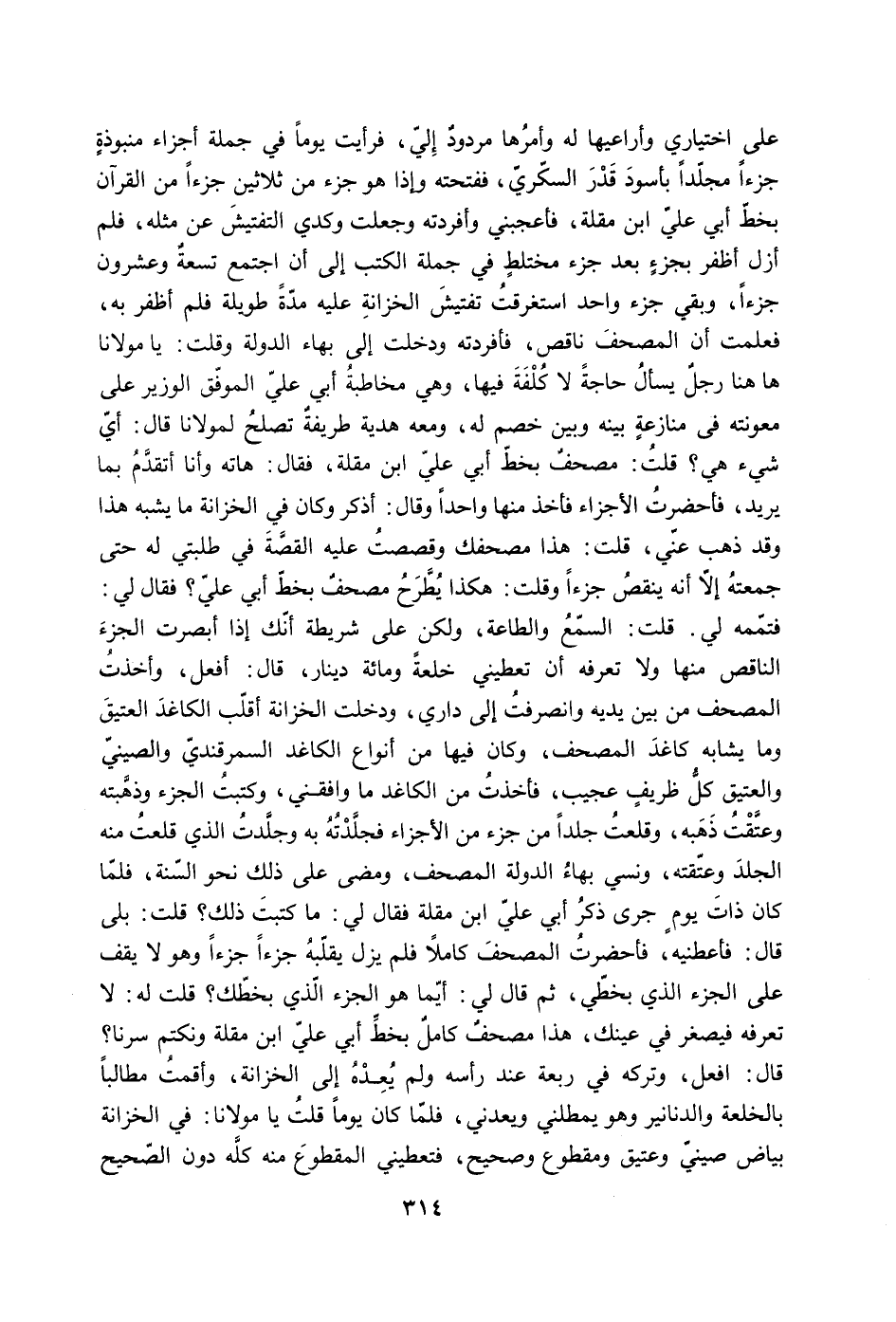 على اختياري وأراعيها له وأمرها مردود إلي، فرأيت يوما في جملة أجزاء منبوذة جزاء مجلدا بأسود قدر السكري، ففتحته وإذا هو جزء من ثلاثين جزءا من القرآن بخط أبي علي ابن مقلة، فأعجبني وأفردته وجعلت وكدي التفتيش عن مثله، فلم أزل أظفر بجزء بعد جزء مختلط في جملة الكتب إلى أن اجتمع تسعة وعشرون جزءا، وبقي جزء واحد استغرقت تفتيش الخزانة عليه عليه مدة طويلة فلم أظفر به، فعلمت أن المصحف ناقص، فأفردته ودخلت إلى بهاء الدولة وقلت: يا مولانا ها هنا رجل يسأل حاجة لا كلفة فيها، وهي مخاطبة أبي علي الموفق الوزير على معونته بينه وبين خصم له، ومعه هدية طريفة تصلح لمولانا قال: أي شيء هي؟ قلت: مصحف بخط أبي علي ابن مقلة، فقال: هاته وأنا أتقدم بما يريد، فأحضرت الأجزاء فأخذ منها واحدا وقال: أذكر وكان في الخزانة ما يشبه هذا وقد ذهب عني، قلت: هذا مصحفك وقصصت عليه القصة في طلبتي له حتى جمعته إلا أنه ينقص جزءا وقلت: هكذا يطرح مصحف بخط أبي علي؟ فقال لي: فتممه لي. قلت: السمع والطاعة، ولكن على شريطة أنك إذا أبصرت الجزء الناقص منها ولا تعرفه خلعة ومائة دينار، قال: أفعل، وأخذت المصحف من بين يديه وانصرفت إلى داري، ودخلت الخزانة أقلب الكاغد العتيق وما يشابه كاغد المصحف، وكان فيها من أنواع الكاغد السمرقندي والصيني والعتيق كل ظريف عجيب، فأخذت من الكاغد ما وافقني، وكتبت الجزء وذهبته وعتقت ذهبه، وقلعت جلدا من جزء من الأجزاء فجلدته به وجلدت الذي قلعت منه الجلد وعتقته، ونسي بهاء الدولة المصحف، ومضى على ذلك نحو السنة، فلما كان ذات يوم جرى ذكر أبي علي ابن مقلة فقال لي: ما كتبت ذلك؟ قلت: بلى قال: فأعطنيه، فأحضرت المصحف كاملا فلم يزل يقلبه جزءا جزءا وهو لا يقف على الجزء الذي بخطي، ثم قال لي: أيما هو الجزء الذي بخطك؟ قلت له: لا تعرفه فيصغر في عينك، هذا مصحف كامل بخط أبي علي ابن مقلة ونكتم سرنا؟ قال: افعل، وتركه في ربعه عند رأسه ولم يعده إلى الخزانة، وأقمت مطالبا بالخلعة والدنانير وهو يمطلني ويعدني، فلما كان يوما قلت يا مولانا: في الخزانة بياض صيني وعتيق ومقطوع وصحيح، فتعطني المقطوع منه كله دون الصحيح