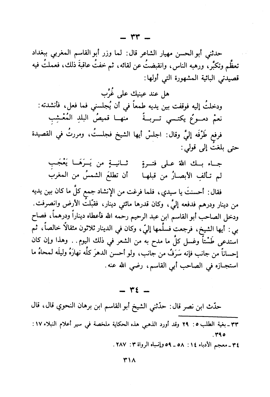لم تألف الأبصار من قبلها ... أن تطلع الشمس من المغرب فقال: أحسنت يا سيدي، فلما فرغت من الإنشاد جمع كل ما كان بين يديه من دينار ودرهم فدفعه إلي، وكان قدرها مائتي دينار، فقبلت الأرض وانصرفت. ودخل الصاحب أبو القاسم ابن عبد الرحيم رحمه الله فأعطاه دينارا ودرهما، فصاح بي: أيها الشيخ، فرجعت فسلمها إلي، وكان في الدينار ثلاثون مثقالا خالصا، ثم استدعى طستا وغسل كل ما مدح به من الشعر في ذلك اليوم.. وهذا وإن كان إحسانا من جانب فإنه سرف من جانب، ولو أحسن الدهر كله نهاره وليله لمحاه ما استجازه في الصاحب أبي القاسم، رضي الله عنه.