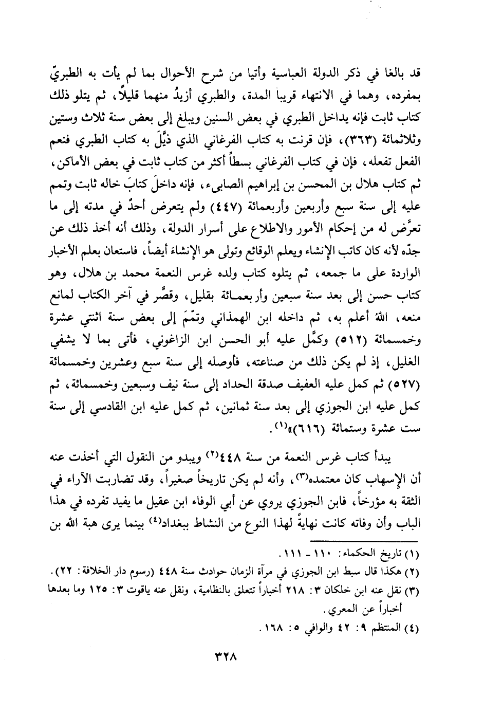 قد بالغا في ذكر الدولة العباسية وأتيا من شرح الأحوال بما لم يأت به الطبري بمفرده، وهما في الانتهاء قريبا المدة، والطبري أزيد منهما قليلاً، ثم يتلو ذلك كتاب ثابت فإنه يداخل الطبري في بعض السنين ويبلغ إلى بعض سنة ثلاث وستين وثلاثمائة (363) ، فإن قرنت به كتاب الفرغاني الذي ذيل به كتاب الطبري فنعم الفعل تفعله، فإن في كتاب الفرغاني بسطاً أكثر من كتاب ثابت في بعض الأماكن، ثم كتاب هلال بن المحسن بن إبراهيم الصابئ، فإنه داخل كتاب خاله ثابت وتمم عليه إلى سنة سبع وأربعين وأربعمائة (447) ولم يتعرض أحد في مدته إلى ما تعرض له من إحكام الأمور والاطلاع على أسرار الدولة، وذلك أنه أخذ ذلك عن جده لأنه كاتب الإنشاء ويعلم الوقائع وتولى هو الإنشاء ويعلم الوقائع وتولى هو الإنشاء أيضاً، فاستعان بعلم الأخبار الواردة على ما جمعه، ثم يتلوه كتاب ولده غرس النعمة محمد بن هلال، وهو كتاب حسن إلى بعد سنة سبعين وأربعمائة بقليل، وقصر في آخر الكتاب لمانع منعه، الله أعلم به، ثم داخله ابن الهمذاني وتمم إلى بعض سنة اثنتي عشرة وخمسمائة (512) وكمل عليه أبو الحسن ابن الزاغوني، فأتى بما لا يشفي الغليل، إذ لم يكن ذلك من صناعته، فأوصله إلى سنة سبع وعشرين وخمسمائة (527) ثم كمل عليه العفيف صدقة الحداد إلى سنة نيف وسبعين وخمسمائة، ثم كمل عليه ابن الجوزي إلى بعد سنة ثمانين، ثم كمل عليه ابن القادسي إلى سنة ست عشرة وستمائة (616) " (1) .