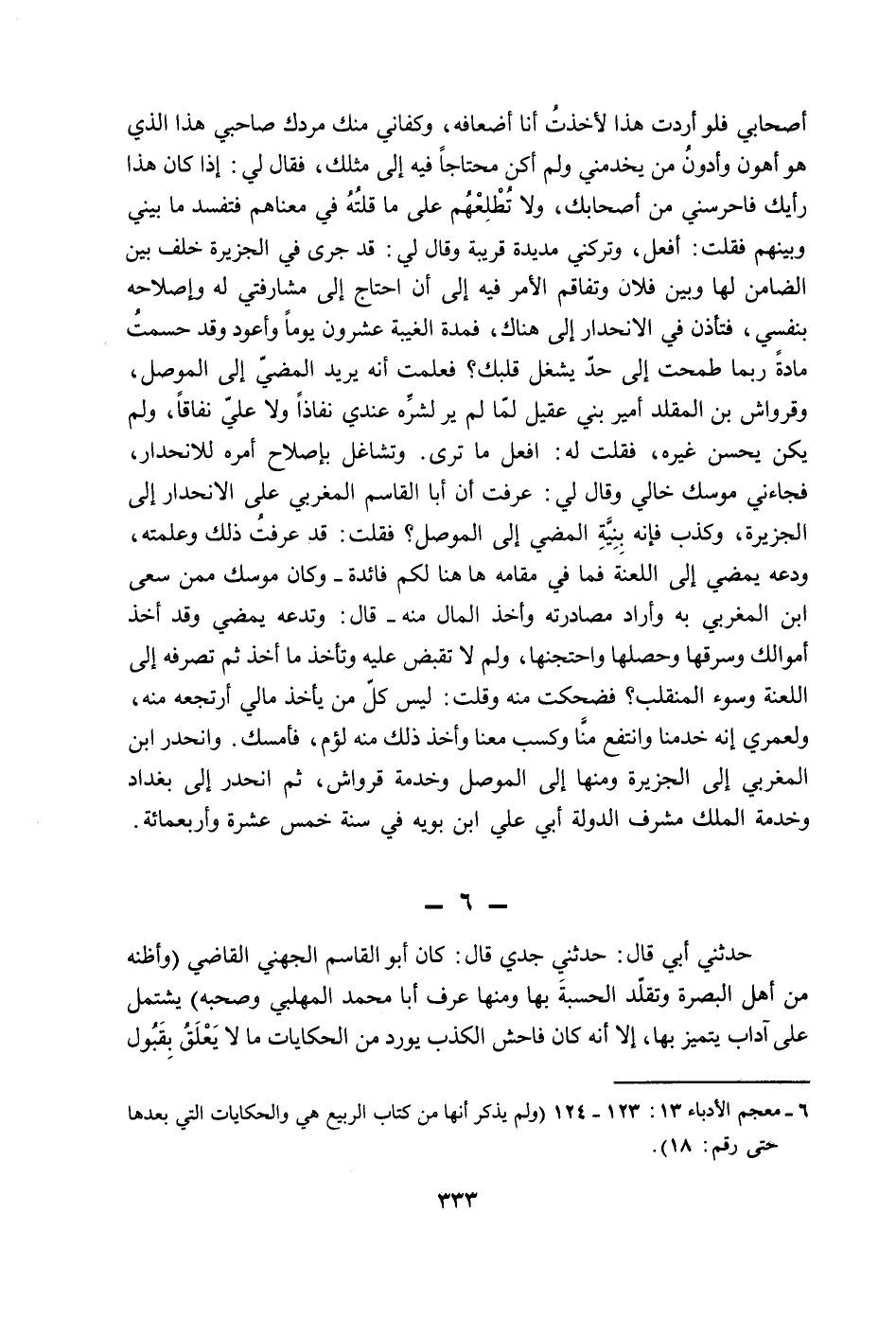 أصحابي فلو أردت هذا لأخذت أنا أضعافه، وكفاني منك مردك صاحبي هذا الذي هو أهون وأدون من يخدمني ولم أكن محتاجاً فيه إلى مثلك، فقال لي: إذا كان هذا رأيك فأحرسني من أصحابك، ولا تطلعهم على ما قلته في معناهم فتفسد ما بيني وبينهم فقلت: أفعل، وتركني مديدة قريبة وقال لي: قد جرى في الجزيرة خلف بين الضامن لها وبين فلان وتفاقم الأمر فيه إلى أن احتاج إلى مشارفتي له وإصلاحه بنفسي، فتأذن في الانحدار إلى هناك، فمدة الغيبة عشرون يوماً وأعود وقد حسمت مادة ربما طمحت إلى حد يشغل قلبك؟ فعلمت أنه يريد المضي إلى الموصل، وقرواش بن المقلد أمير بني عقيل لما لم ير لشره عندي نفاذاً ولا عليّ نفاقاً، ولم يكن يحسن غيره، فقلت له: افعل ما ترى. وتشاغل بإصلاح أمره للانحدار، فجاءني موسك خالي وقال لي: عرفت أن أبا القاسم المغربي على الانحدار إلى الجزيرة، وكذب فإنه بنية المضي إلى الموصل؟ فقلت: قد عرفت ذلك وعلمته، ودعه يمضي إلى اللعنة فما في مقامه ها هنا لكم فائدة وكان موسك ممن سعى ابن المغربي به وأراد مصادرته وأخذ المال منه قال: وتدعه يمضي وقد أخذ أموالك وسرقها وحصلها واحتجنها، ولم لا تقبض عليه وتأخذ ما أخذ ثم تصرفه إلى اللعنة وسوء المنقلب؟ فضحكت منه وقلت: ليس كل من يأخذ مالي أرتجعه منه، ولعمري إنه خدمنا وانتفع منا وكسب معنا وأخذ ذلك منه لؤم، فأمسك. وانحدر ابن المغربي إلى الجزيرة ومنها إلى الموصل وخدمة قرواش، ثم إنحدر إلى بغداد وخدمة الملك مشرف الدولة أبي عليّ ابن بويه في سنة خمس عشرة وأربعمائة.