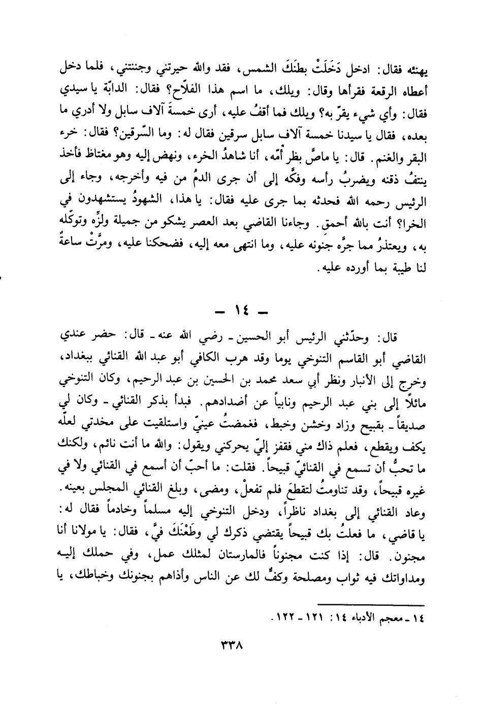 قال: وحدثني الرئيس أبو الحسين رضي الله عنه قال: حضر عندي القاضي أبو القاسم التنوخي يوماً وقد هرب الكافي أبو عبد الله القنائي ببغداد، وخرج إلى الأنبار ونظر أبي سعد محمد بن الحسين بن عبد الرحيم، وكان التنوخي مائلاً إلى بني عبد الرحيم ونابياً عن أضدادهم. فبدأ بذكر القنائي وكان لي صديقاً بقبيح وزاد وخشن وخبط، فغمضت عيني واستلقيت على مخدتي لعله يكف ويقطع، فعلم ذاك مني فقفز إلي يحركني ويقول: والله ما أنت نائم، ولكنك ما تحب أن تسمع في القنائي قبيحاً. فقلت: ما أحب أن أسمع في القنائي ولا في غيره قبيحاً، وقد تناومت لتقطع فلم تفعل، ومضى، وبلغ القنائي المجلس بعينه. وعاد القنائي إلى بغداد ناظراً، ودخل التنوخي إليه مسلماً وخادماً فقال له: يا قاضي، ما فعلت بك قبيحاً يقتضي ذكرك لي وطعنك في، فقال: يا مولانا أنا مجنون. قال: إذا كنت مجنوناً فالمارستان لمثلك عمل، وفي حملك إليه ومداواتك فيه ثواب ومصلحة وكف لك عن الناس وأذاهم بجنونك وخباطك، يا