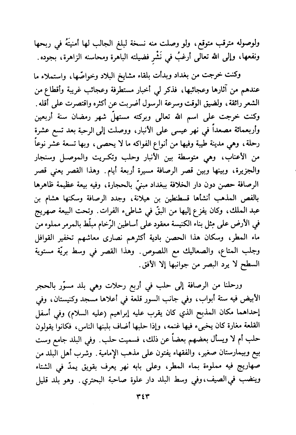 ورحلنا من الرصافة إلى حلب في أربع رحلات وهي بلد مسور بالحجر الأبيض فيه ستة أبواب، وفي جانب السور قلعة في أعلاها مسجد وكنيستان، وفي إحداهما مكان المذبح الذي كان يقرب عليه إبراهيم (عليه السلام) وفي أسفل القلعة مغارة كان يخبئ فيها غنمه، وإذا حلبها أضاف بلبنها الناس، فكانوا يقولون حلب أم لا ويسأل بعضهم بعضاً عن ذلك، فسميت حلب. وفي البلد جامع وست بيع وبيمارستان صغير، والفقهاء يفتون على مذهب الإمامية. وشرب أهل البلد من صهاريج فيه مملوءة بماء المطر، وعلى بابه نهر يعرف بقويق يمد في الشتاء وينضب في الصيف، وفي وسط البلد دار علوة صاحبة البحتري. وهو بلد قليل