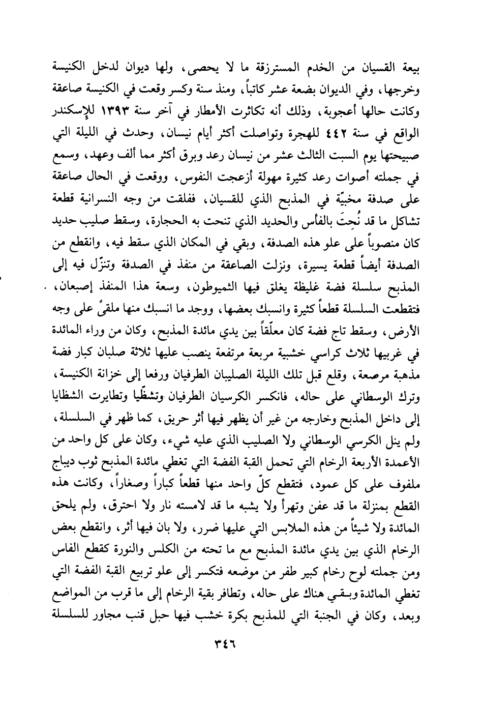 بيعة القسيان من الخدم المسترزقة ما لا يحصى، ولها ديوان لدخل الكنيسة وخرجها، وفي الديوان بضعة عشر كتابا، ومنذ سنة وكسر وقعت في الكنيسة صاعقة وكانت حالها أعجوبة، وذلك أنه تكاثرت الأمطار في آخر سنة 1393 للإسكندر الواقع في سنة 442 للهجرة وتواصلت أكثر أيام نيسان، وحدث في الليلة التي صبيحتها يوم السبت الثالث عشر من نيسان رعد وبرق أكثر مما ألف وعهد، وسمع في جملته أصوات رعد كثيرة مهولة أزعجت النفوس، ووقعت في الحال صاعقة على صدفة مخيبة في المذبح الذي للقسيان، ففلقت من وجه النسرانية قطعة تشاكل ما قد نحت بالفأس والحديد الذي تنحت به الحجارة، وسقط صليب حديد كان منصوبا على علو هذه الصدفة، وبقي في المكان الذي سقط فيه، وانقطع من الصدفة أيضا قطعة يسيرة، ونزلت الصاعقة من منفذ في الصدفة وتنزل فيه إلى المذبح سلسلة فضة غليظة يغلق فيها الثميوطون، وسعة هذا المنفذ إصبعان، فتقطعت السلسلة قطعا كثيرة وانسبك بعضها، ووجد ما انسبك منها ملقى على وجه الأرض، وسقط تاج فضة كان معلقا بين يدي مائدة المذبح، وكان من وراء المائدة في غربيها ثلاث كراسي خشبية مربعة مرتفعة ينصب عليها ثلاث صلبان كبار فضة مذهبة مرصعة، وقلع قبل تلك الليلة الصليبان الطرفيان ورفعا إلى خزانة الكنيسة، وترك الوسطاني على حاله، فانكسر الكرسيان الطرفيان وتشظيا وتطايرت الشظايا إلى داخل المذبح وخارجه من غير أن يظهر فيها أثر حريق، كما ظهر في السلسلة، ولم ينل الكرسي الوسطاني ولا الصليب الذي عليه شيء، وكان على كل واحد من الأعمدة الأربعة الرخام التي تحمل القبة الفضة التي تغطي مائدة المذبح ثوب ديباج ملفوف على كل عمود، فتقطع كل واحد منها قطعا كبارا وصغارا، وكانت هذه القطع بمنزلة ما قد عفن وتهرأ ولا يشبه ما قد لامسته نار ولا احتراق، ولم يلحق المائدة ولا شيئا من هذه الملابس التي عليها ضرر، ولا بان فيها أثر، وانقطع بعض الرخام الذي بين يدي مائدة المذبح مع ما تحته من الكلس والنورة كقطع الفاس ومن جملته لوح رخام كبير طفر من موضعه فتكسر إلى علو تربيع القبة الفضة التي تغطي المائدة وبقي هناك على حاله، وتطافر بقية الرخام إلى ما قرب من المواضع وبعد، وكان في الجنبة التي للمذبح بكرة خشب فيها حبل قنب مجاور للسلسة