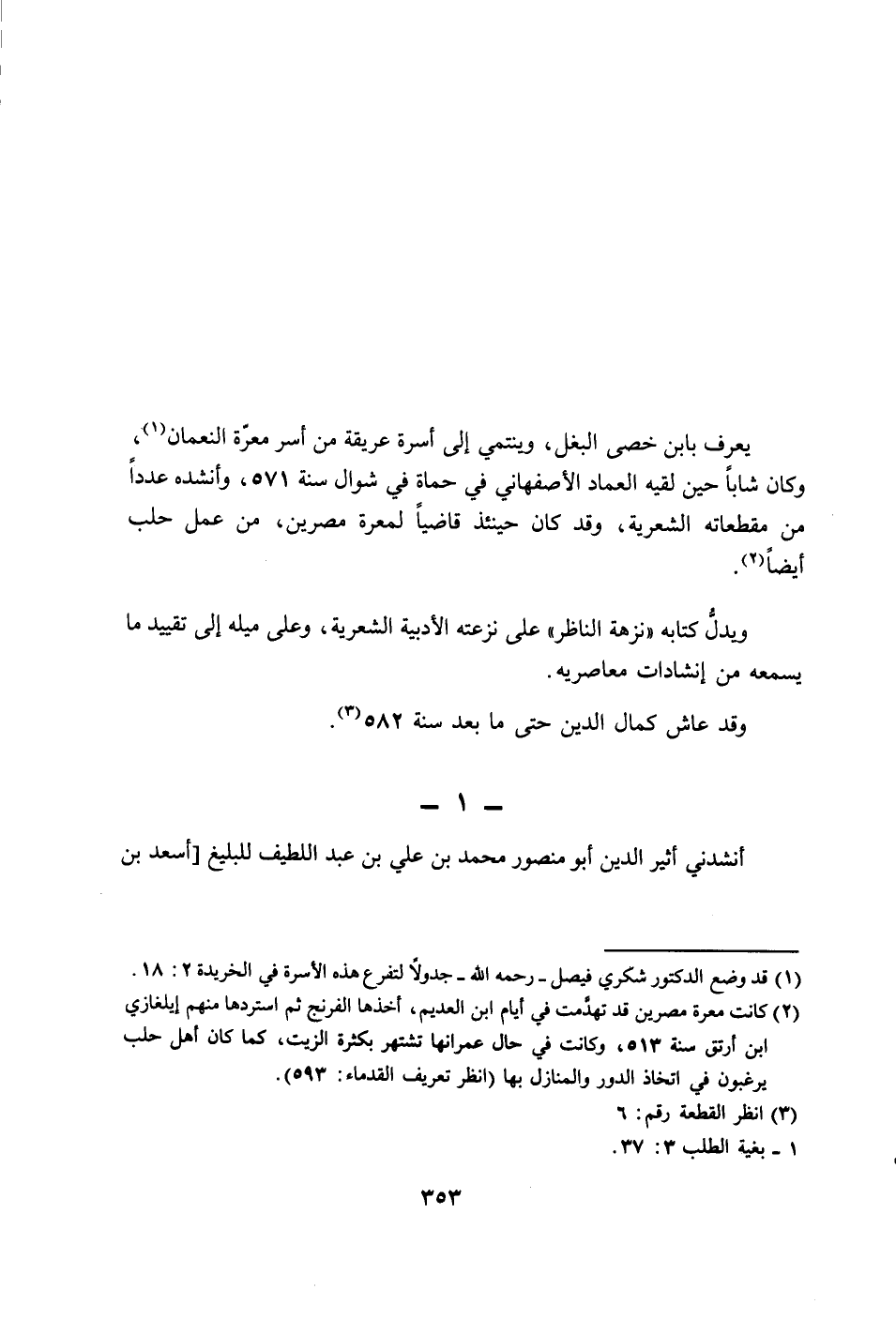 (2) كانت معرة مصرين قد تهدمت في أيام ابن العديم، أخذها الفرنج ثم استردها منهم إيلغازي ابن أرنق سنة 513، وكانت في حال عمرانها تشتهر بكثرة الزيت، كما كان أهل حلب يرغبون في اتخاذ الدور والمنازل بها (انظر تعريف القدماء: 593) .