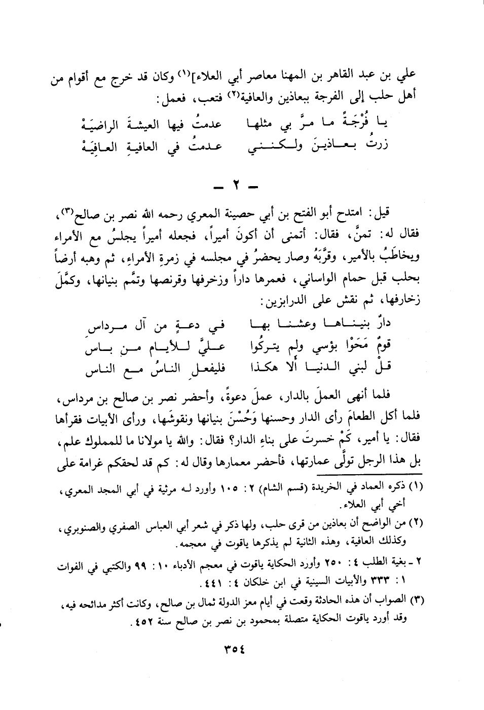 (4) الصواب أن هذه الحادثة وقعت في أيام معز الدولة ثمال بن صالح، وكانت أكثر مدائحه فيه، وقد أورد ياقوت الحكاية متصلة بمحمود بن نصر بن صالح سنة 452.